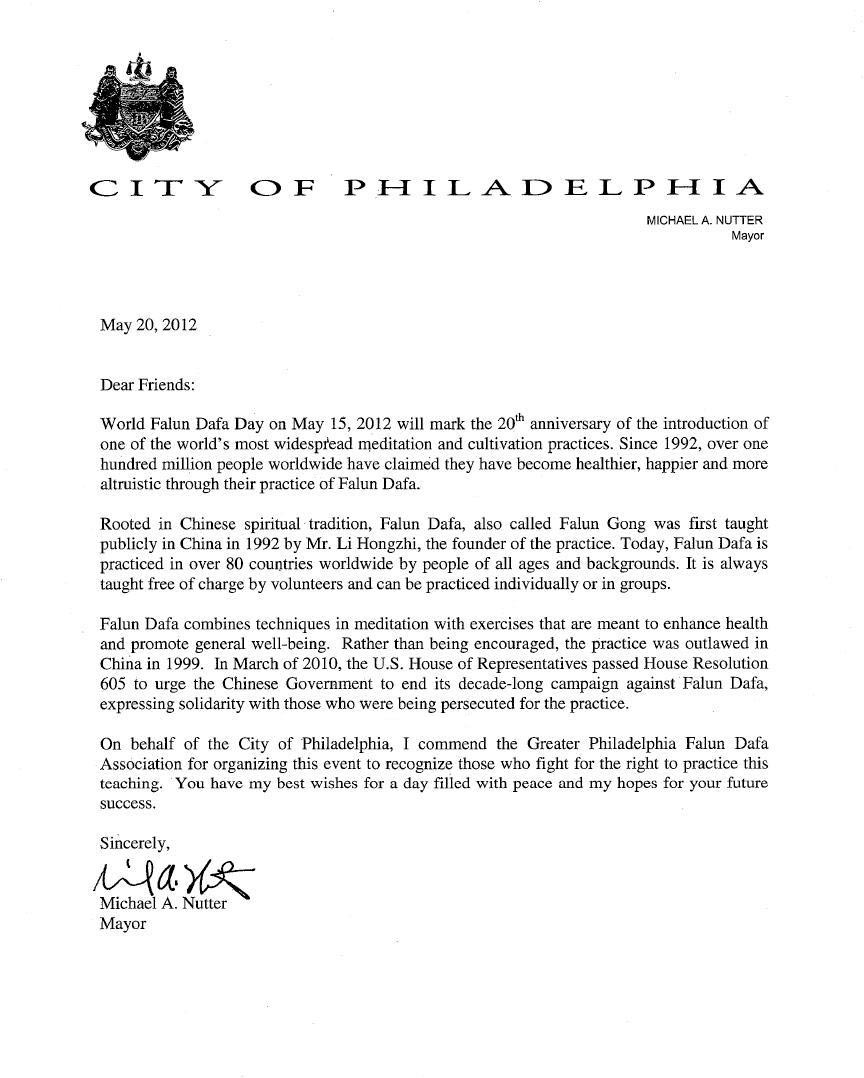 【明慧网二零一二年五月十三日】二零一二年五月十三日是“第十三届世界法轮大法日”,又是法轮大法洪传世界二十周年的纪念日。日前,美国费城市长致信给大费城地区法轮功修炼者,表达他们对世界法轮大法日的良好祝愿。