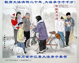 ![]() 道路两旁随处可以看到,手里拿着法轮功真相资料在阅读的路人 |