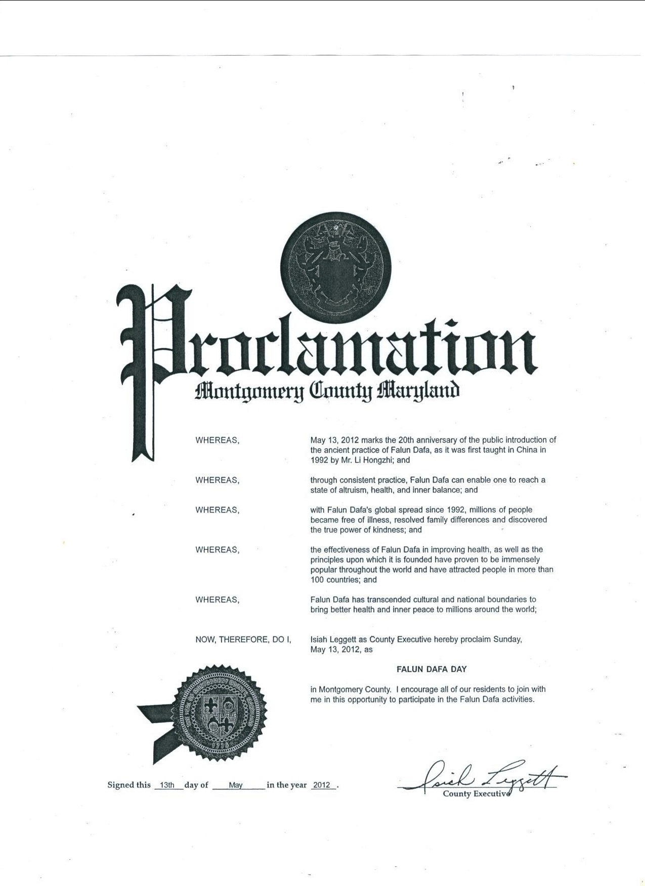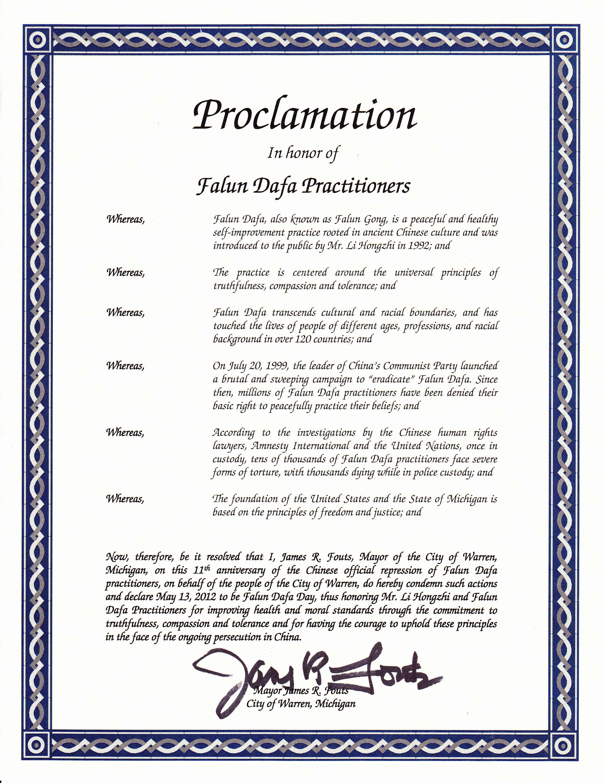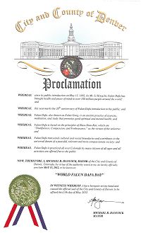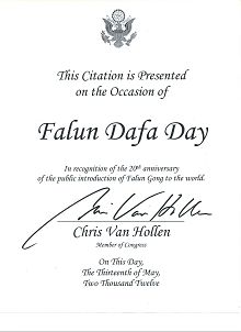 【明慧网二零一二年五月十三日】二零一二年五月十三日是“第十三届世界法轮大法日”,又是法轮大法洪传世界二十周年的纪念日。日前,美国费城市议会颁发褒奖,表达他们对世界法轮大法日的良好祝愿。