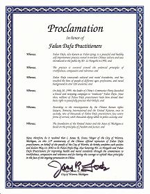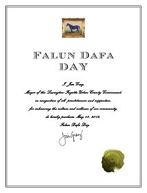 鉴于,美国的法轮大法弟子贡献了无数小时的时间为社区组织免费的打坐教课、中国文化的音乐会、舞蹈、以及参加当地的社区活动。他们还积极努力、平和地促进结束在中国对法轮功的迫害,使这个人口最多的国家有更好的未来;
