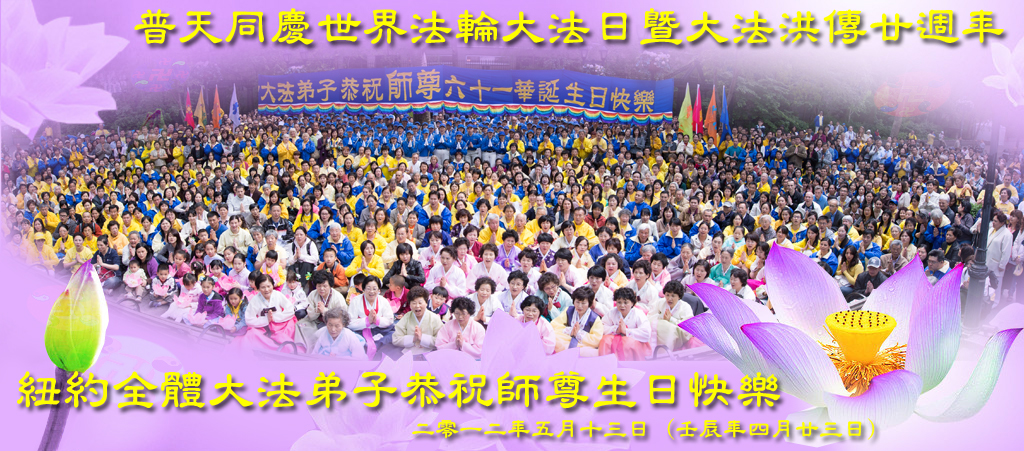 【明慧网二零一二年五月十三日】(明慧记者章韵、肖妍、舒静纽约报道)五月十三日是世界法轮大法日,大法洪传二十周年纪念日。二零一二年五月十二日,约七千名来自世界各地的法轮大法修炼者汇聚在纽约,在曼哈顿华埠举行盛大游行,庆祝法轮大法弘传于世二十周年,庆祝第十三届“世界法轮大法日”,感恩法轮大法创始人李洪志先生将“真、善、忍”这宇宙大法公诸于世,传于世人,感谢师尊的慈悲救度。