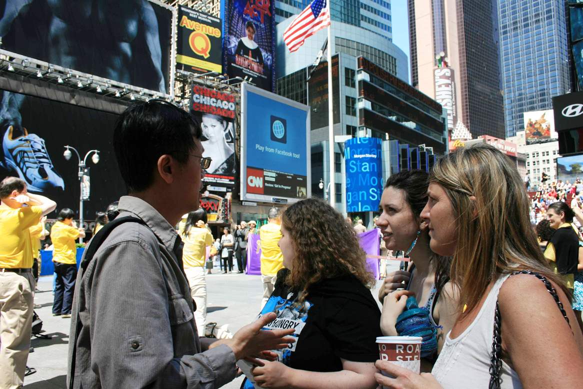 对很多法轮功学员来说,当他们在看似偶然的机会中得到了法轮大法,会感到幸福从天而降。对于当天从时代广场路过的人们来说,又何尝不是如此?