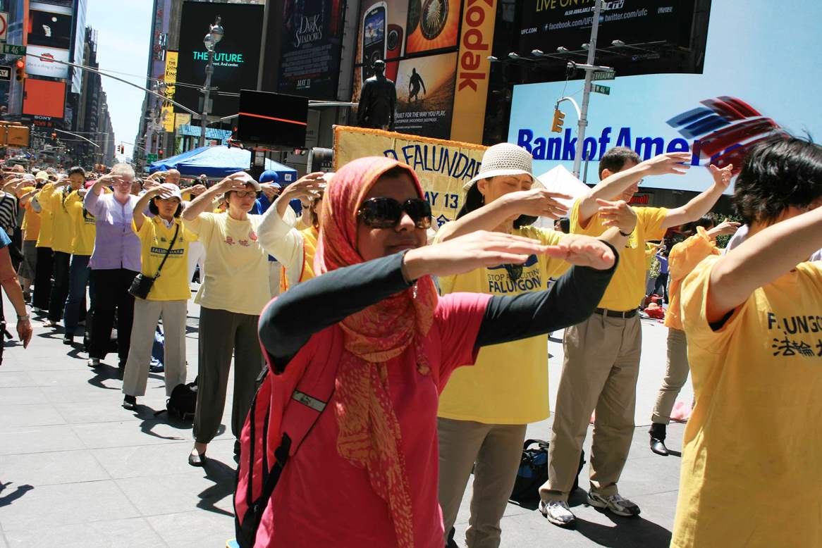 王女士还说,这么多民众在修炼法轮功,引起了当时的中共党魁江泽民的极度恐惧。出于妒嫉,江泽民于一九九九年七月违法地宣布不许炼法轮功,并动用全部国家机器迫害法轮功。“今天我们就在纽约最有地标意义的时代广场举办活动,让民众了解法轮功多么美好,对法轮功的迫害是多么荒唐。”她还说,“今天,很多人都表示要来学功。”“我想要不多久,更多的人都会了解中共对法轮功的迫害,都会起来对迫害说‘不’。”