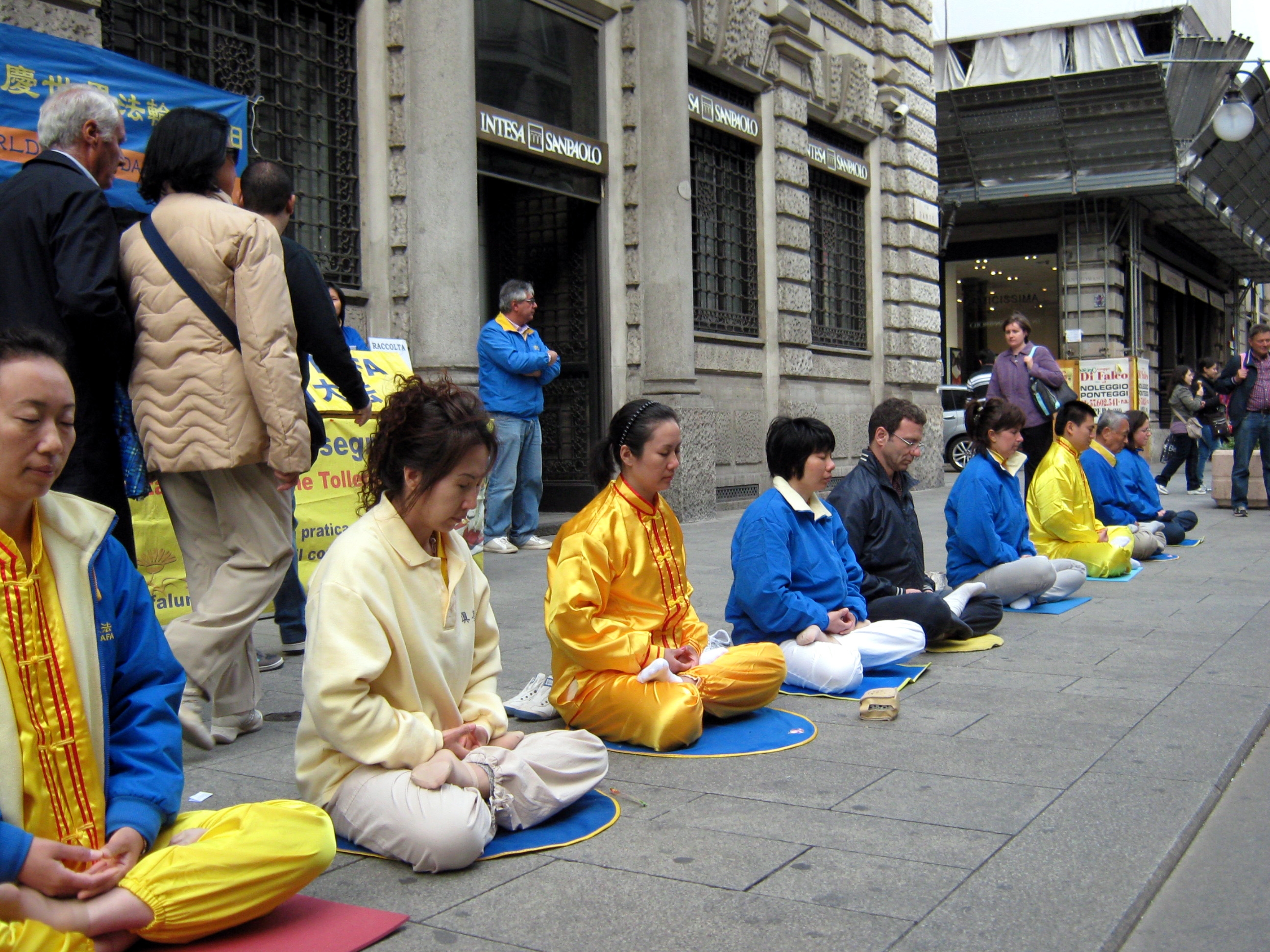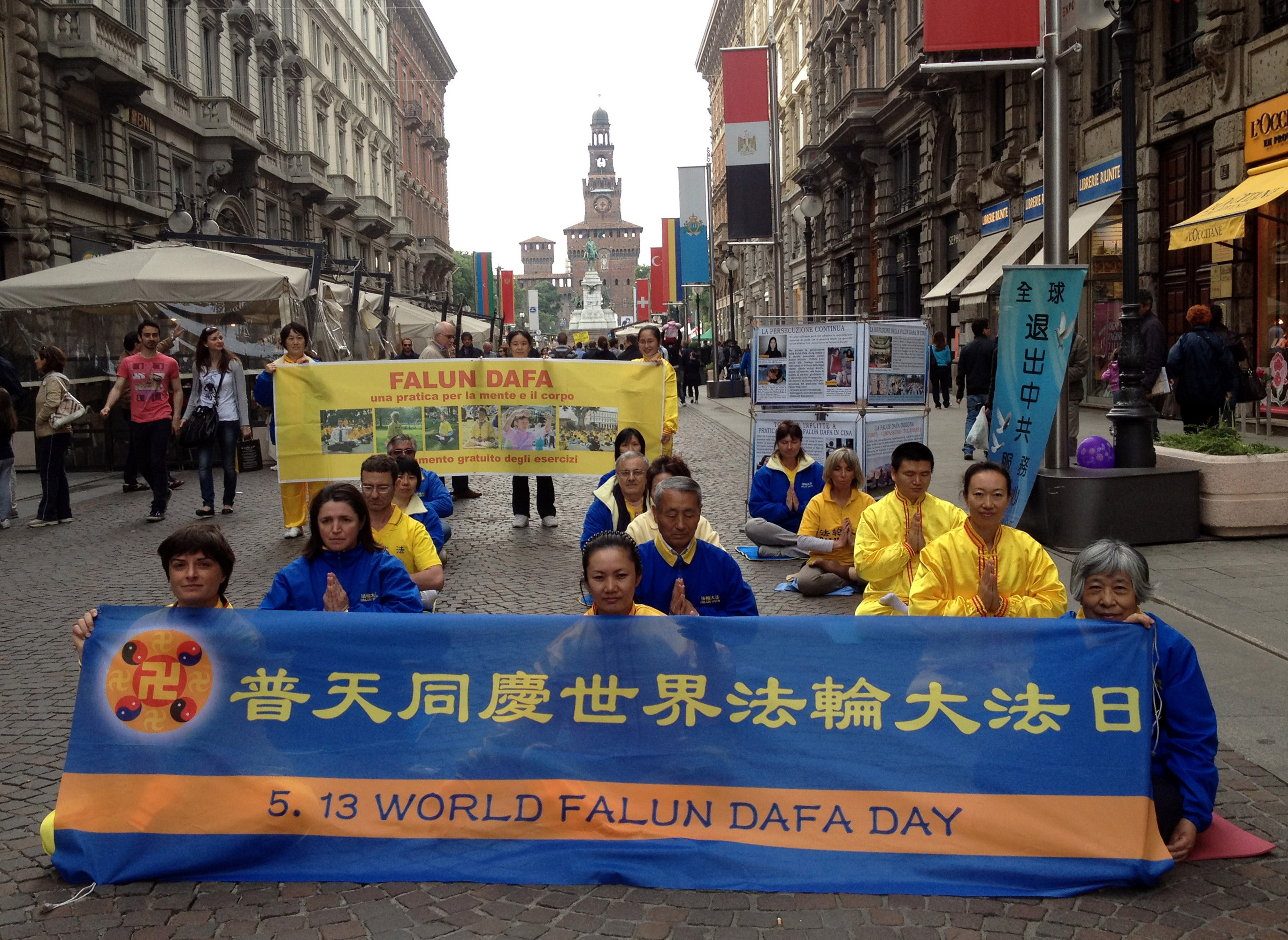 在以《神曲》的作者,大文豪但丁命名的步行街(via Dante)上,法轮功学员以炼功的方式庆祝世界法轮大法日,不少游客拿起相机争相拍下这一盛况。
