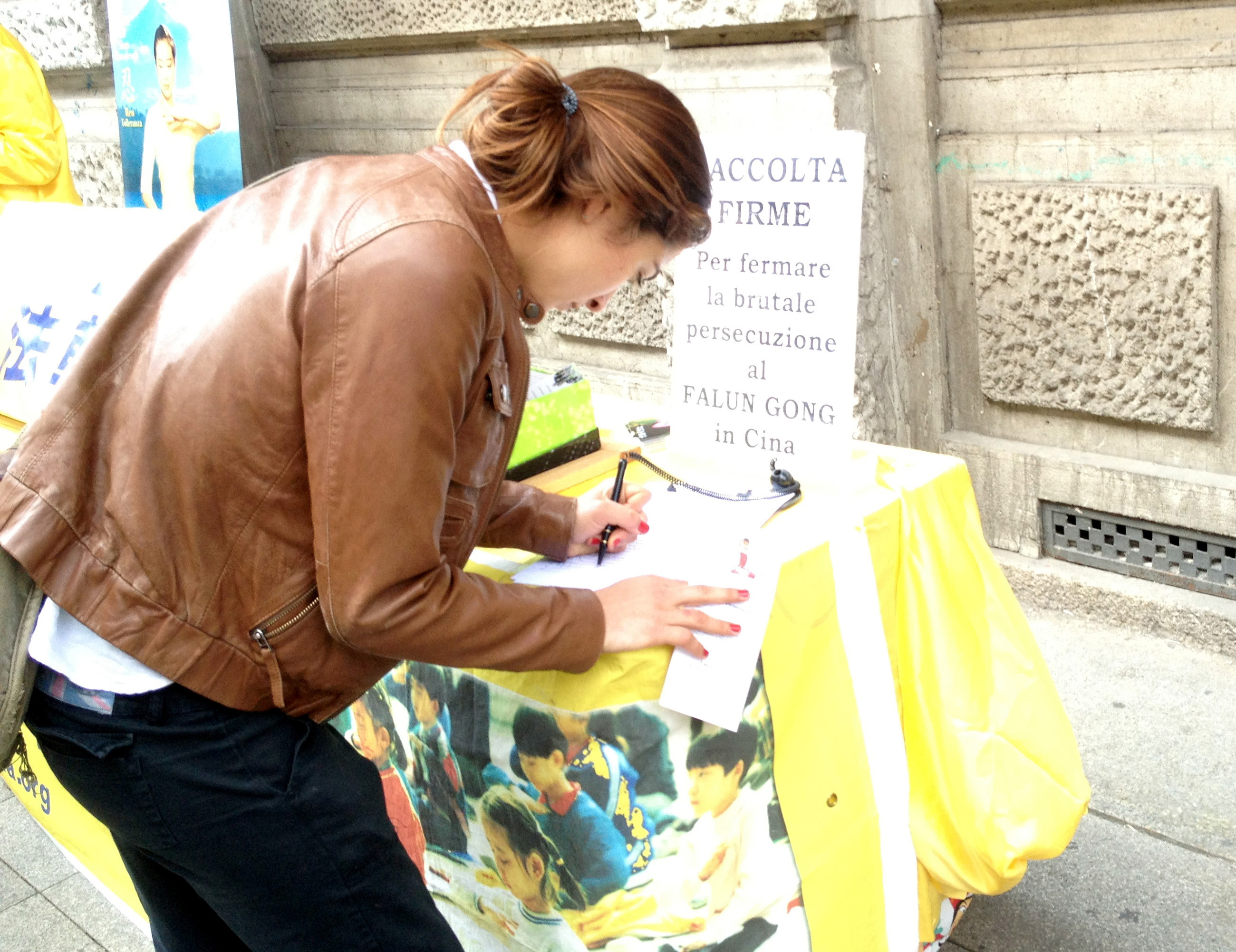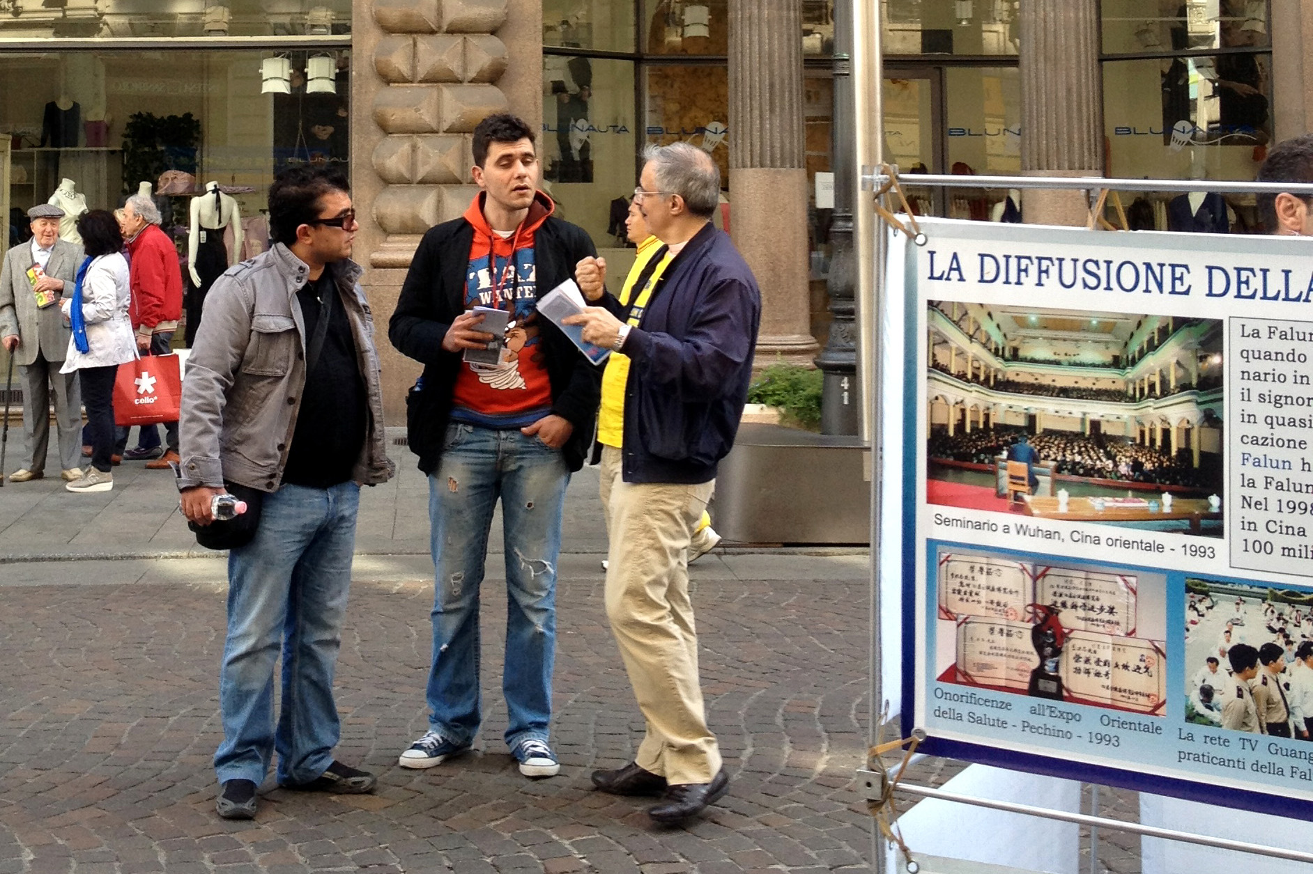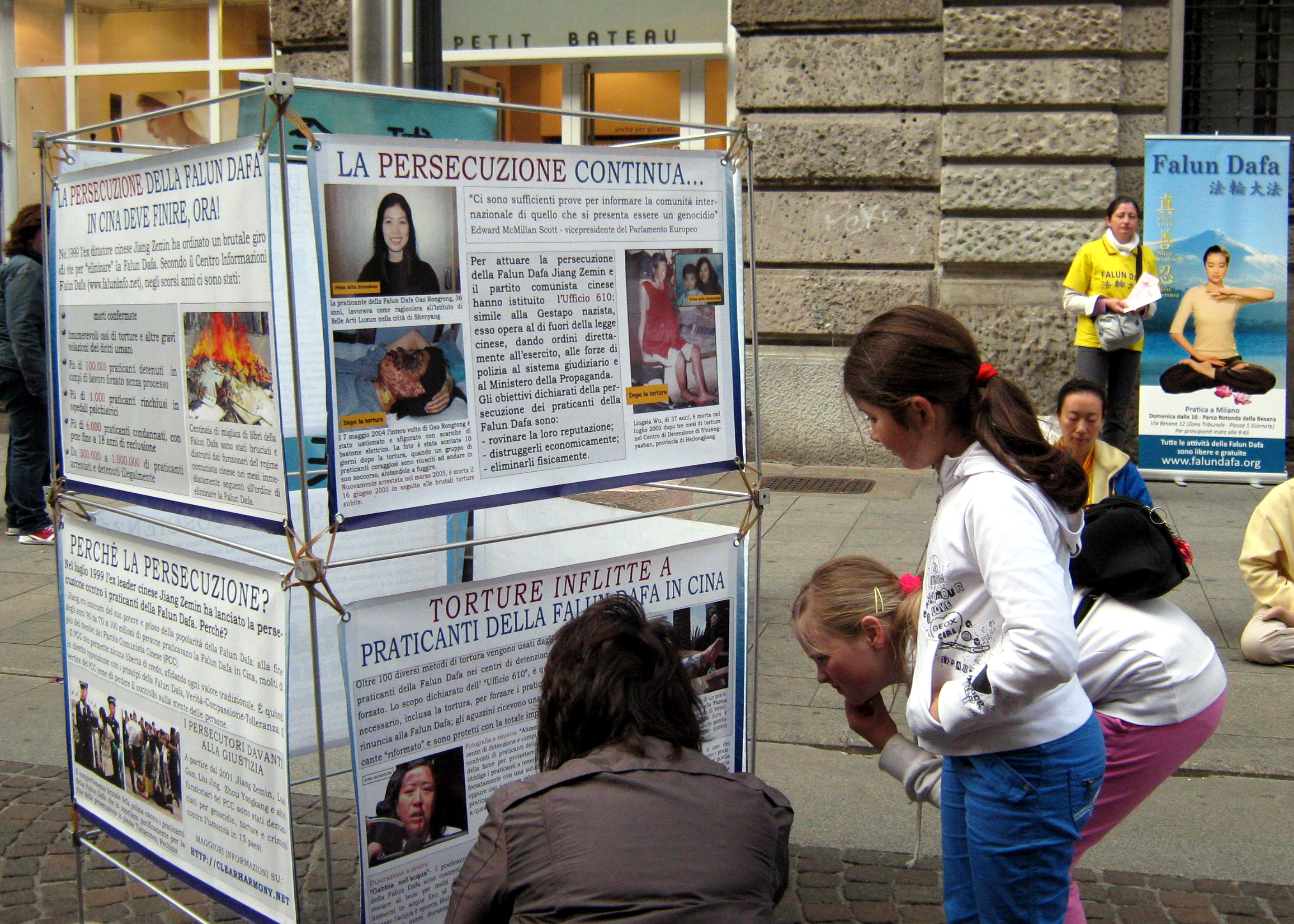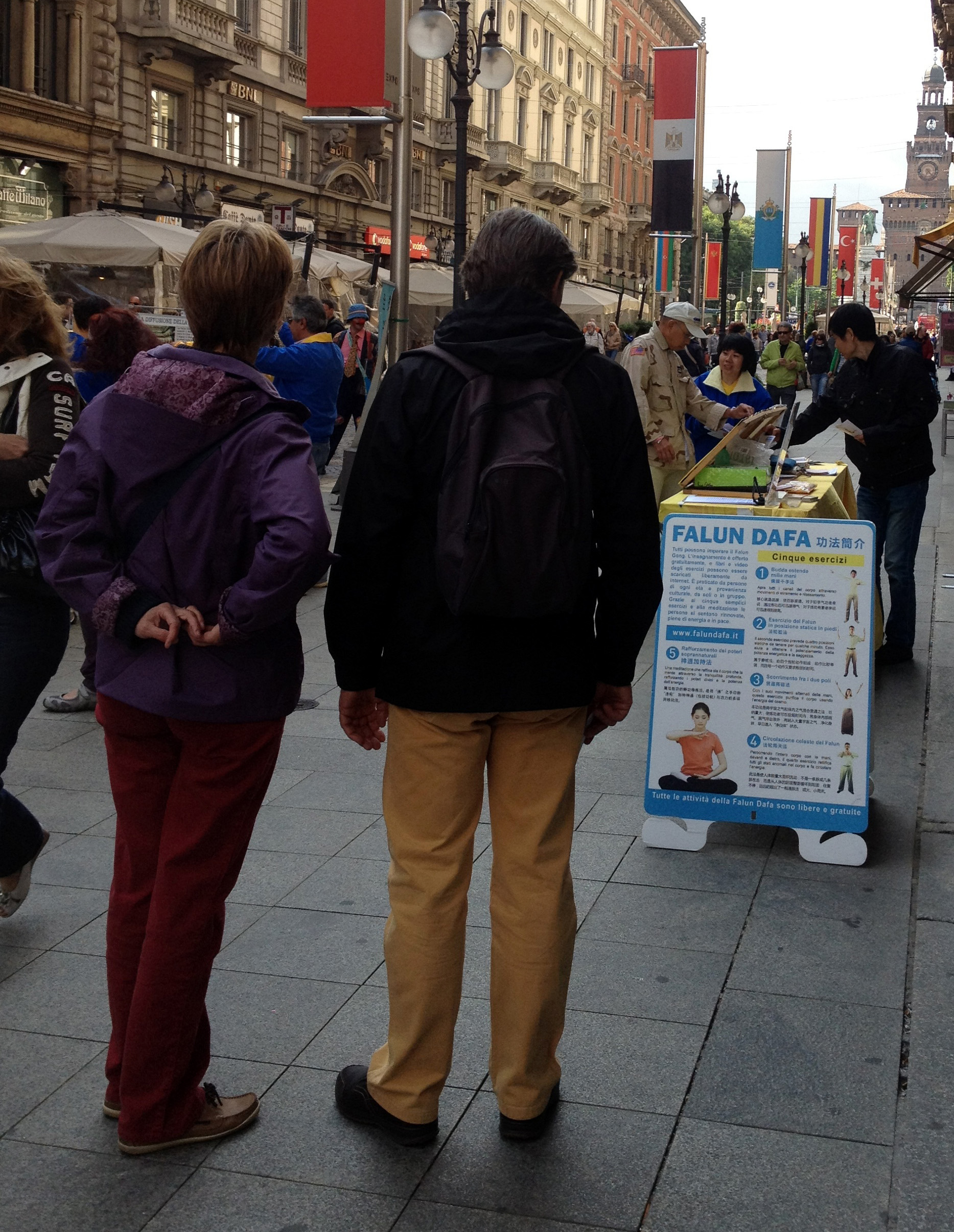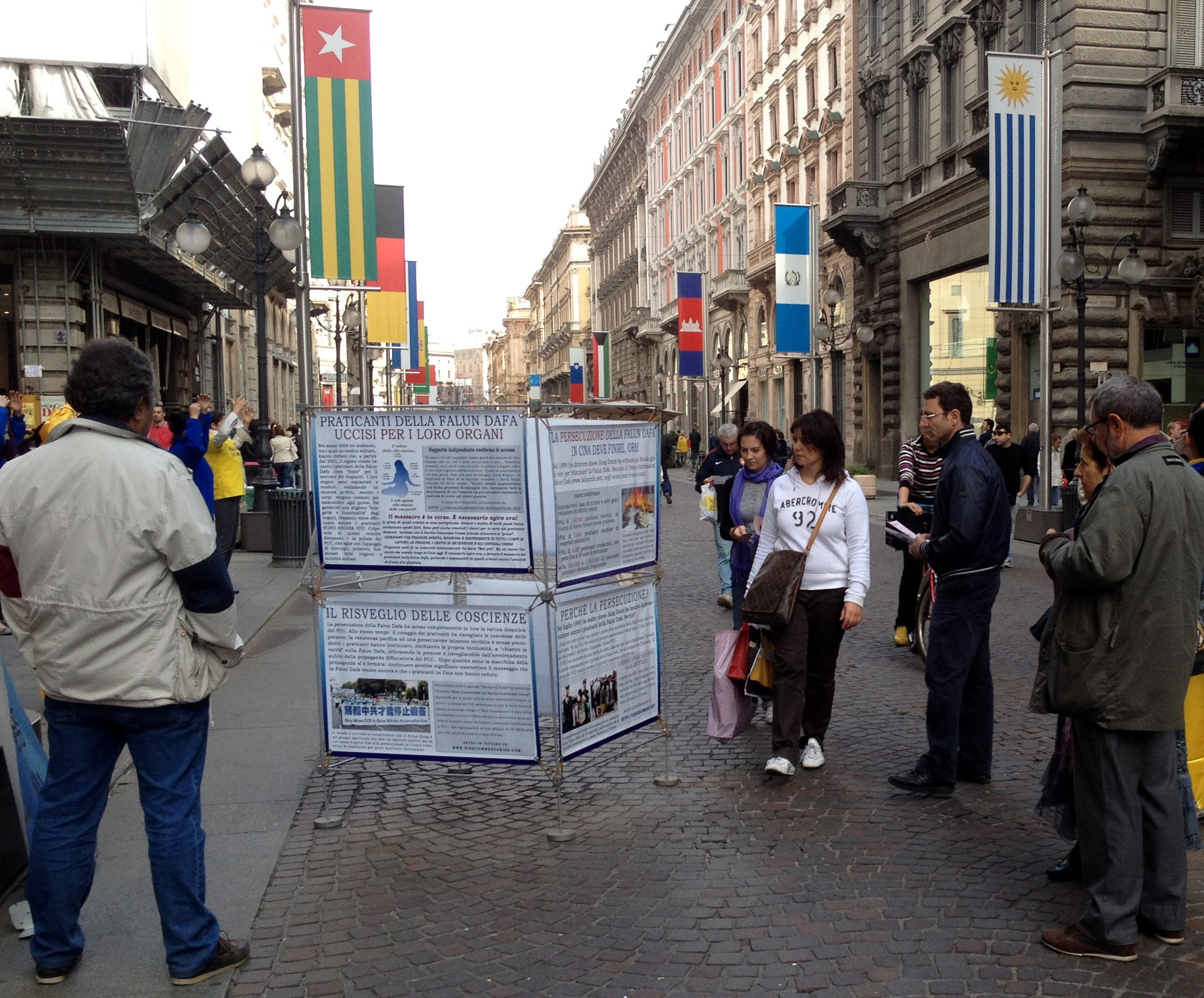 法轮功真相展板也吸引了不少经过的游客,意大利民众和其他族裔民众停下脚步,静静地观看展板或真相资料,了解在中国大陆已经持续了十三年,至今还没有停止的中共对法轮功的残酷迫害。