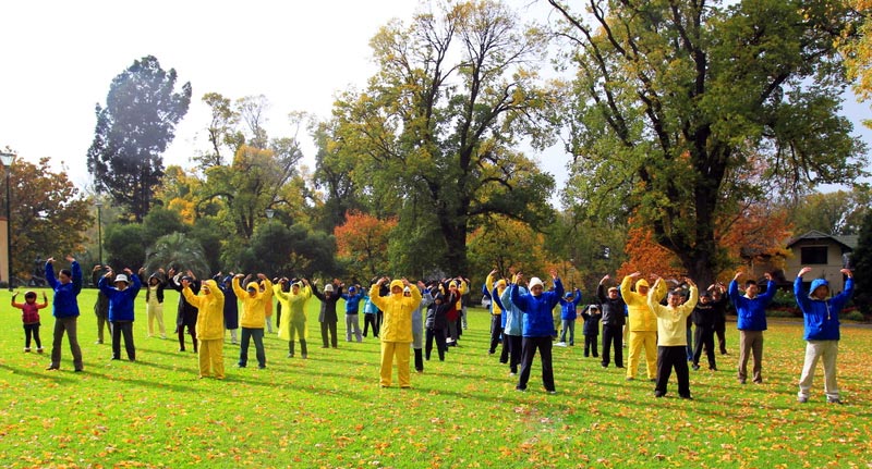 ![]() 五月十三日,墨尔本法轮功学员在著名的菲茨罗伊花园集体炼功。 |