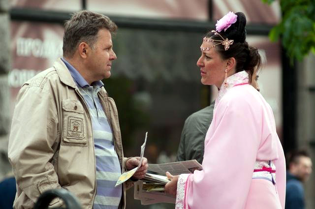【明慧网二零一二年五月十六日】二零一二年五月十三日,乌克兰首都基辅市(Kyiv)的法轮大法学员欢聚在市中心大街,热烈庆祝法轮大法传世二十周年。同时,来自乌克兰另外三个城市的学员在即将举办欧洲世界杯足球锦标赛的顿涅茨克州也举行了庆祝活动。