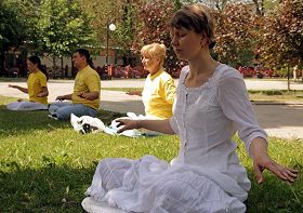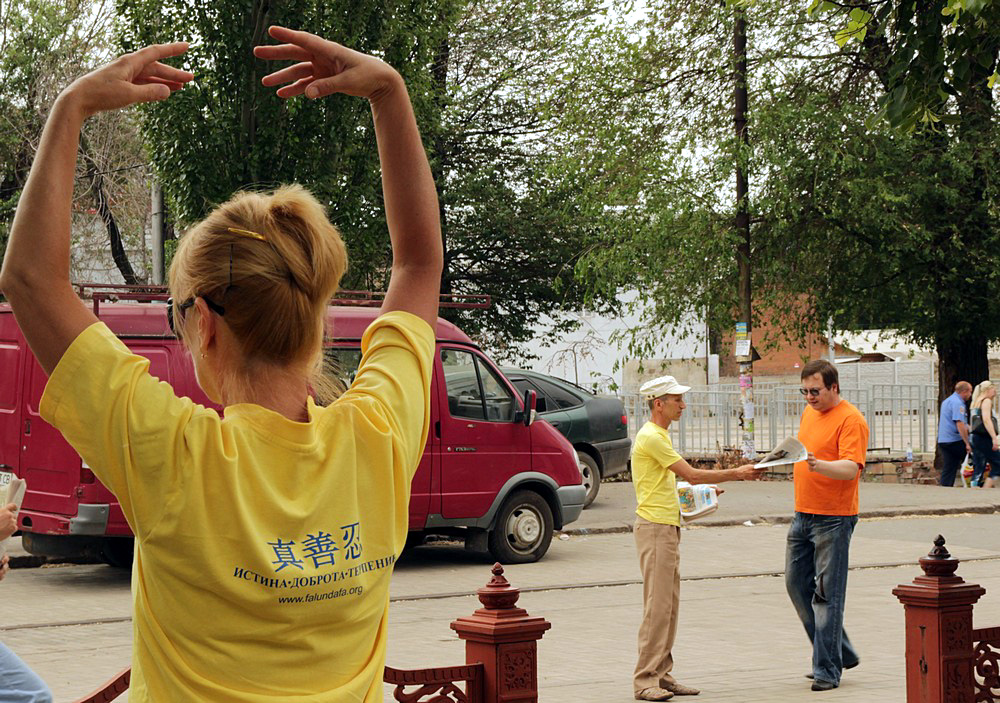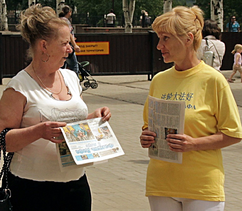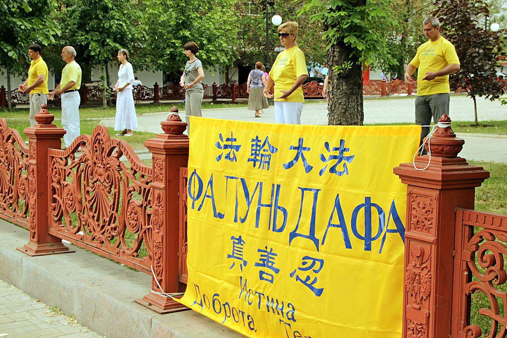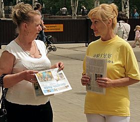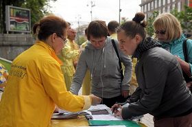 在乌克兰顿涅茨克州,学员们在顿涅茨克州(Donietsk State)的中心公园炼功、洪法。一位中年女士说,她流着泪看完了法轮功学员制作的真相资料。她说:“不敢相信在中国发生着对修炼‘真、善、 忍’的法轮功学员的迫害,共产党是非常邪的,只要有共产党的地方,老百姓就不会有好日子过。”最后,这位女士请了一本《转法轮》,希望能更深入地了解法轮功。