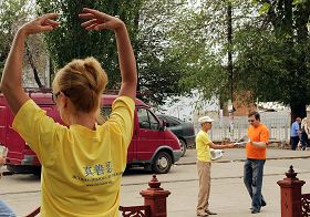 一位男士告诉学员,早上经过活动地点看到学员在炼功,下午回家他特意选择此条路,为了再能看到这优美祥和的炼功场面。他说:“有一种力量牵引我来到这里。你们的动作和表情、优美的炼功音乐都深深的吸引着我。”
