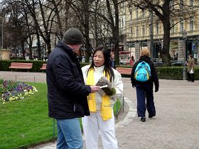 一位台湾的游客了解真相后离开了,不一会,他又走回活动的区域,并拿出五十欧元给学员,表示对此活动的支持,学员没有接受,并善意对其解释学员是义务教功,不存钱、不存物,但是,学员还是感谢该游客的心意。