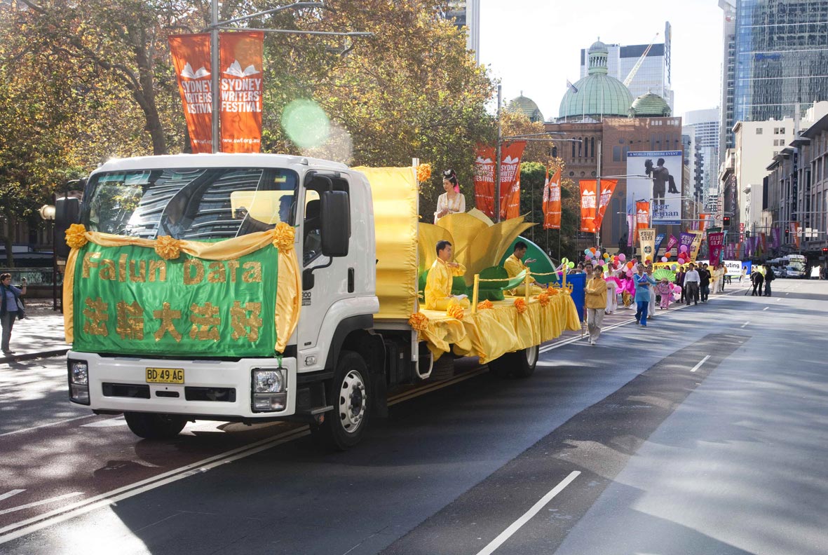 中午时分,法轮功学员以最敬仰和感恩的心,向法轮大法创始人李洪志大师恭贺六十一华诞。下午两点多,法轮功学员举行了大游行活动,喜庆大法在世界洪传二十周年。游行队伍从悉尼市中心的Park大街开始,一直到唐人街结束。“世界法轮大法日”庆祝活动和大游行已经被悉尼市批准成为当地固定的一年一度的民族节日之一,游行当天,市政府交通部门和警察会在市中心暂时关闭部份道路,为游行开路。