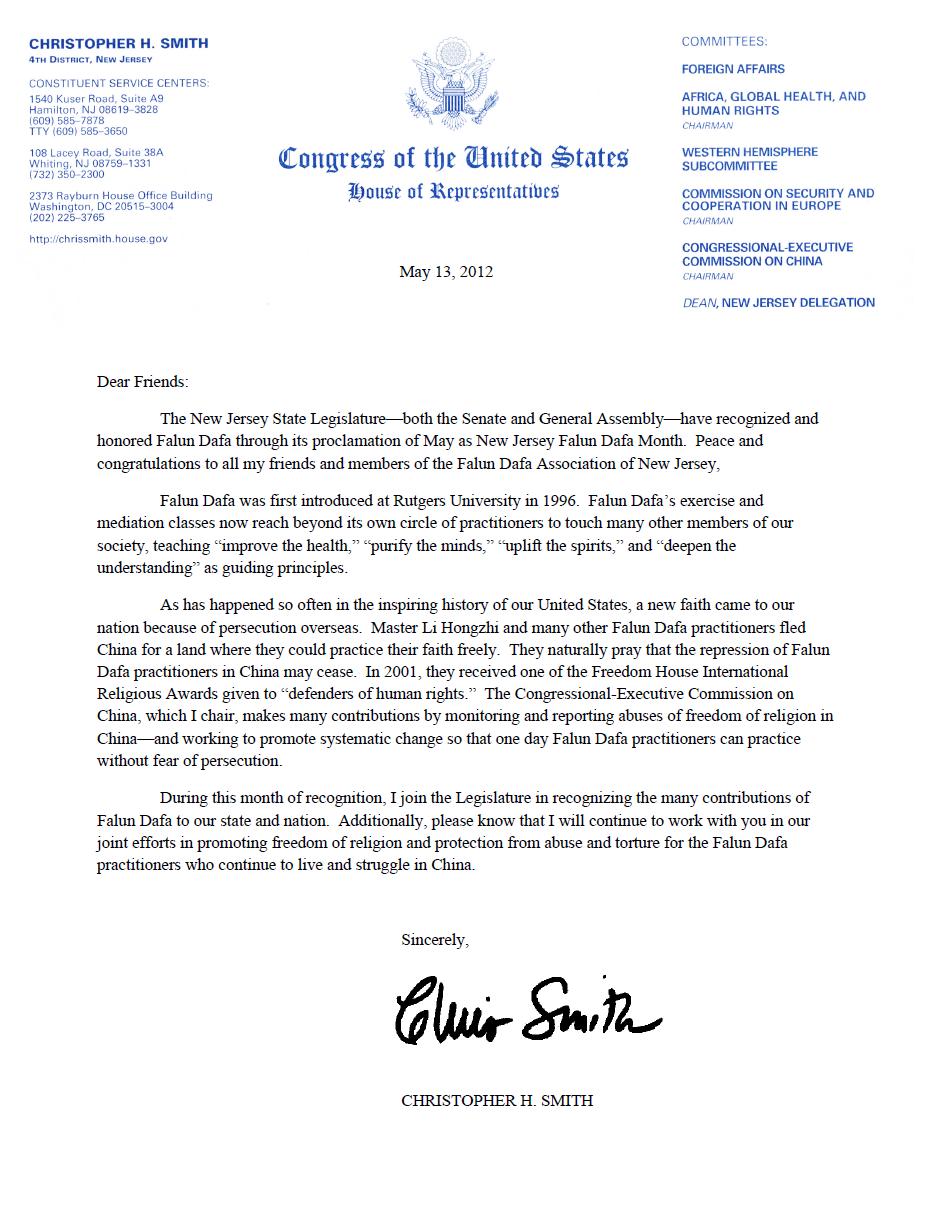 在震撼人心的美国历史中,许多新的信仰因为其在另外国家受到的迫害而来到美国。李洪志大师和许多法轮大法学员离开中国,来到这片能够让他们自由坚守信仰的土地。他们期盼在中国发生的对法轮大法学员的迫害能够停止。在二零零一年,他们获得了国际自由之家颁发给“人权捍卫者”的宗教自由奖。由我担任主席的国会及行政部门中国问题委员会,已经在对于中国宗教自由的监督和酷刑报导上做出了许多贡献,并且正致力于推动一系列的变革,让法轮大法学员有一天能够自由修炼,不受迫害。