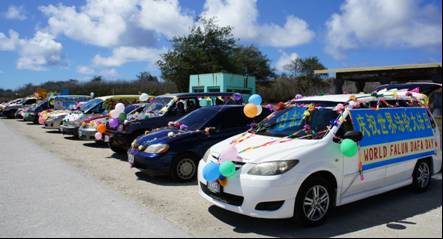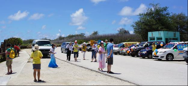 早晨十二辆以气球、鲜花,彩带、横幅等装饰漂亮的花车,整齐有序的排列在塞班岛美国公园。花车的装饰及横幅的内容有“恭祝师尊生日快乐”、“庆祝世界法轮大法日”、“法轮大法好”,以展现了大法的美好,及大法弟子对师尊慈悲苦度的感谢。