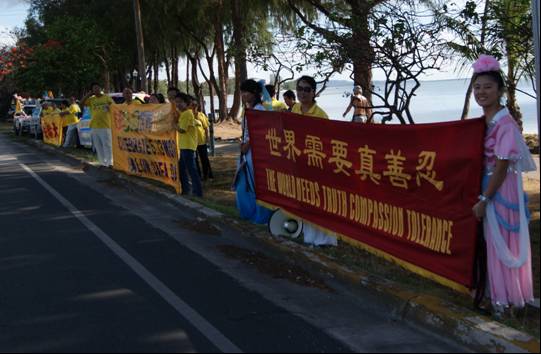 景点的活动结束后原路返回开往中间路,这是塞班岛两条主要交通线之一,有序的车队及音乐吸引了当地民众的目光。到达一个交通繁华区,花车再一次停下来。大法弟子手持“五一三世界法轮大法日”、“法轮大法好”、“世界需要真善忍”三条横幅向过往的车辆及行人挥手。过往的车辆有的鸣笛,有的以微笑及挥手来表示支持。