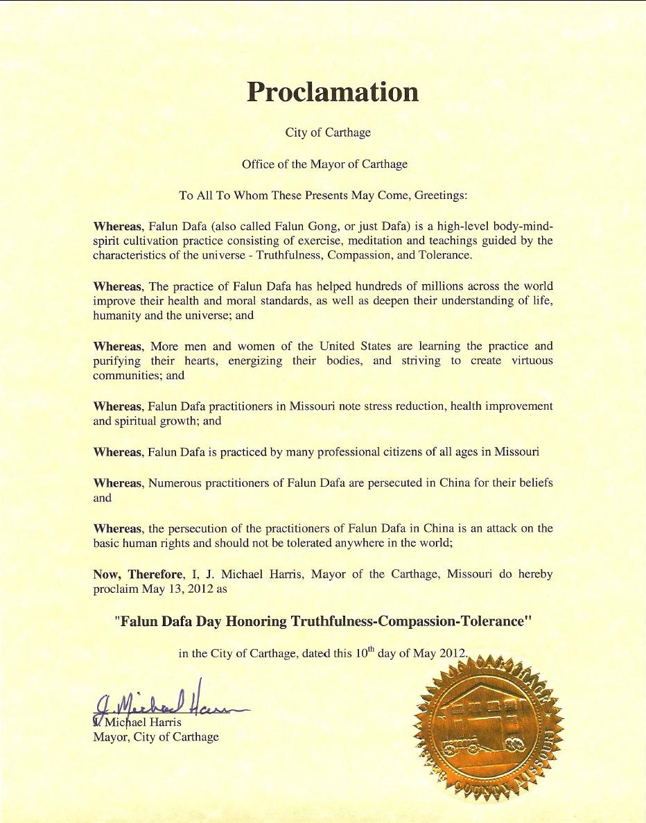 鉴此,我,迦太基市市长迈克尔·哈里斯,特此宣告二零一二年五月十三日为迦太基市