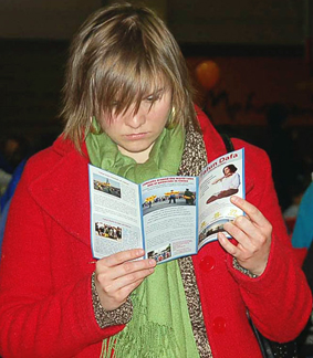 一位法轮功学员在路过一家中餐馆时,看见一大巴车,车内是来自中国着装“武术”字样的少年学生。学员把手里还剩的几份真相报纸送给他们后,“谢谢”之声不断传出。