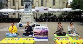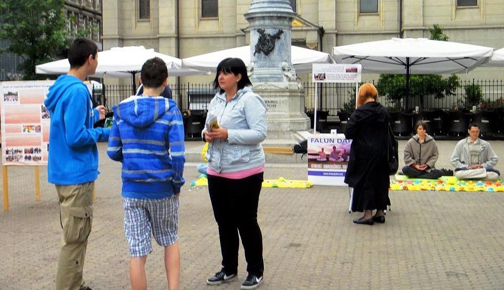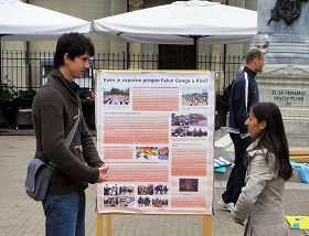 周末有许多游客参观首都,醒目的横幅,多彩的莲花也吸引了游人。不少人饶有兴趣地观看学员演示功法。递给他们克罗地亚语真相传单时,他们遗憾地摇摇头说:“我们不会说克罗地亚语。”但是,当学员提供英文传单时,他们就很高兴地马上接过去并认真阅读起来。一对前来度假的美国夫妇和学员交谈,谈到了正在中国发生的关于中共对法轮功学员的残酷迫害,丈夫说,他以前听说过迫害,但他并不知道那么多的详情和细节。他说:“你看,我们没有拿传单,但仍然从你那里了解到了很多的真实而详尽的信息,非常感谢你。“