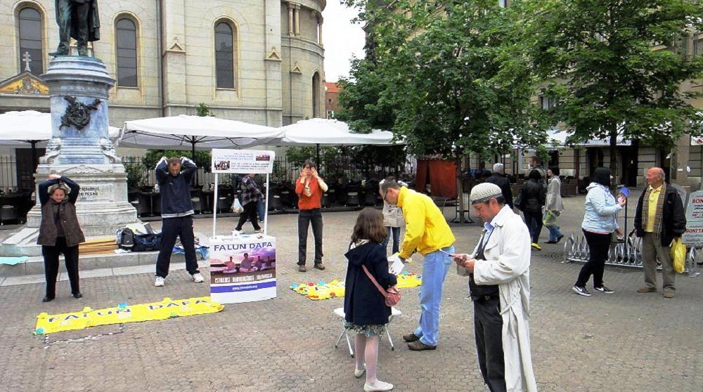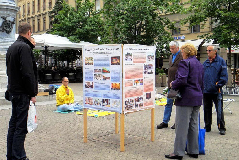 克罗地亚的大法弟子在首都萨格勒布市中心开展纪念活动。向当地民众介绍法轮功,并揭露中共对法轮功持续十三年的。