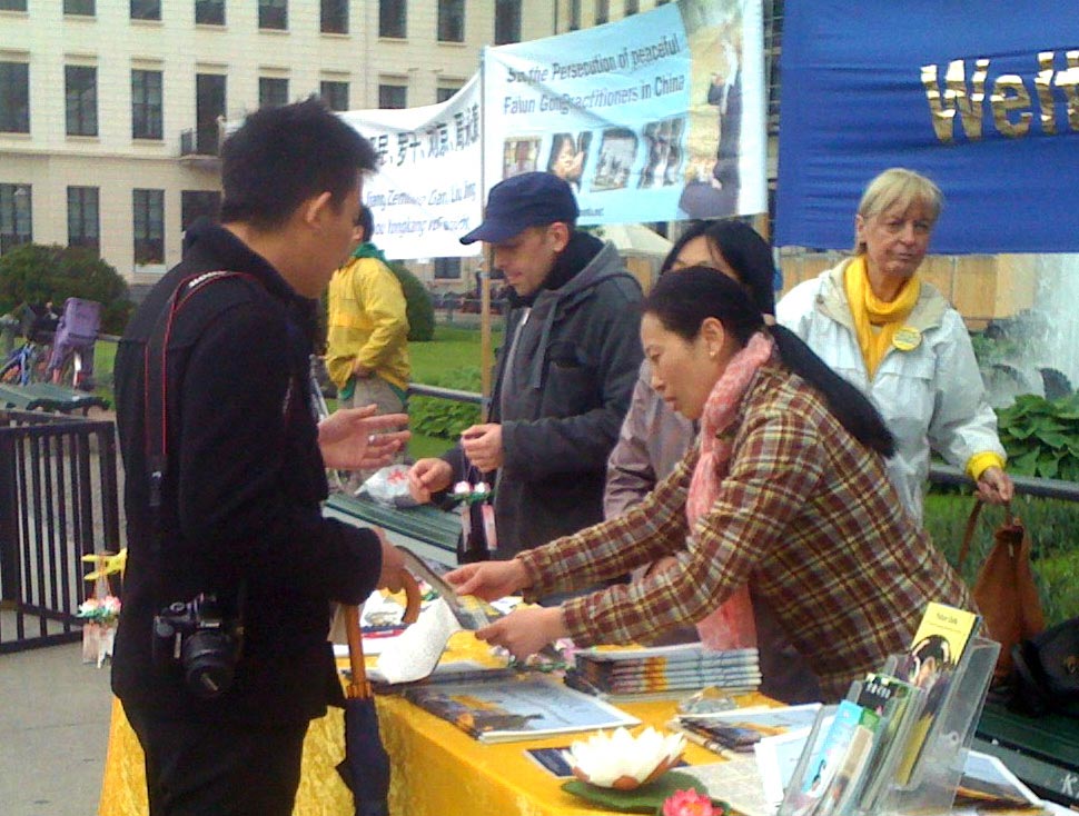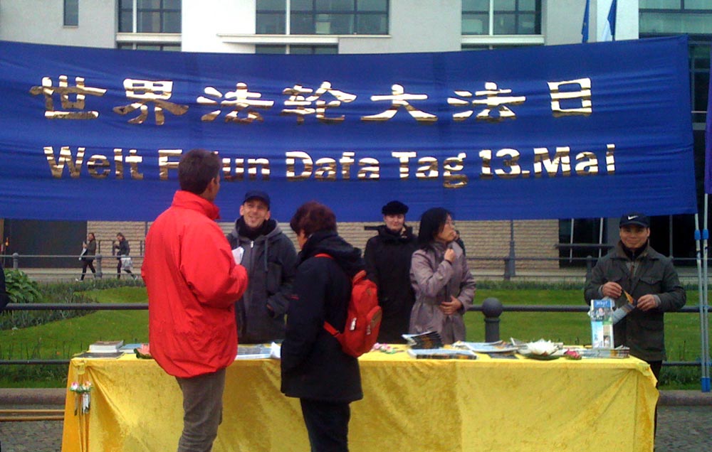 柏林的大法弟子们以炼功、发资料告诉人们法轮大法真相来庆祝这个特殊的日子,表达他们对师父将“真、 善、忍”这宇宙大法传于世人的感恩。同时揭露中共邪*党-对大法弟子的酷刑迫害,呼吁共同制止迫害。