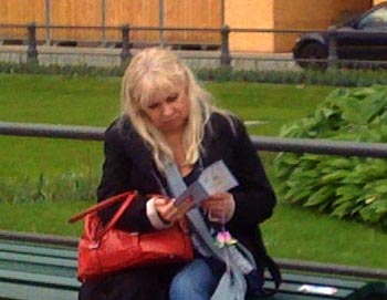 ![]() 一位女士拿到介绍法轮功的传单后,马上坐在旁边看了起来 |