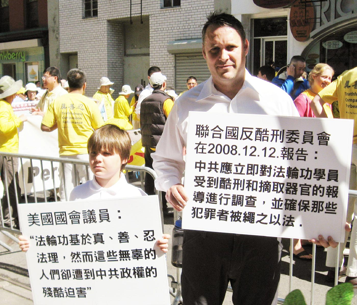 暑期活动中心主任艾尔(Al)与八岁的儿子本(Ben Whitted)来自美国北卡来纳州。当被问及为何而来,第一次来纽约参加这样的集会的本有些腼腆地手指着展板上的真、善、忍三字,没有言语。父亲替儿子解释,他们来到这里是为正义发声,制止中共对法轮功的迫害。