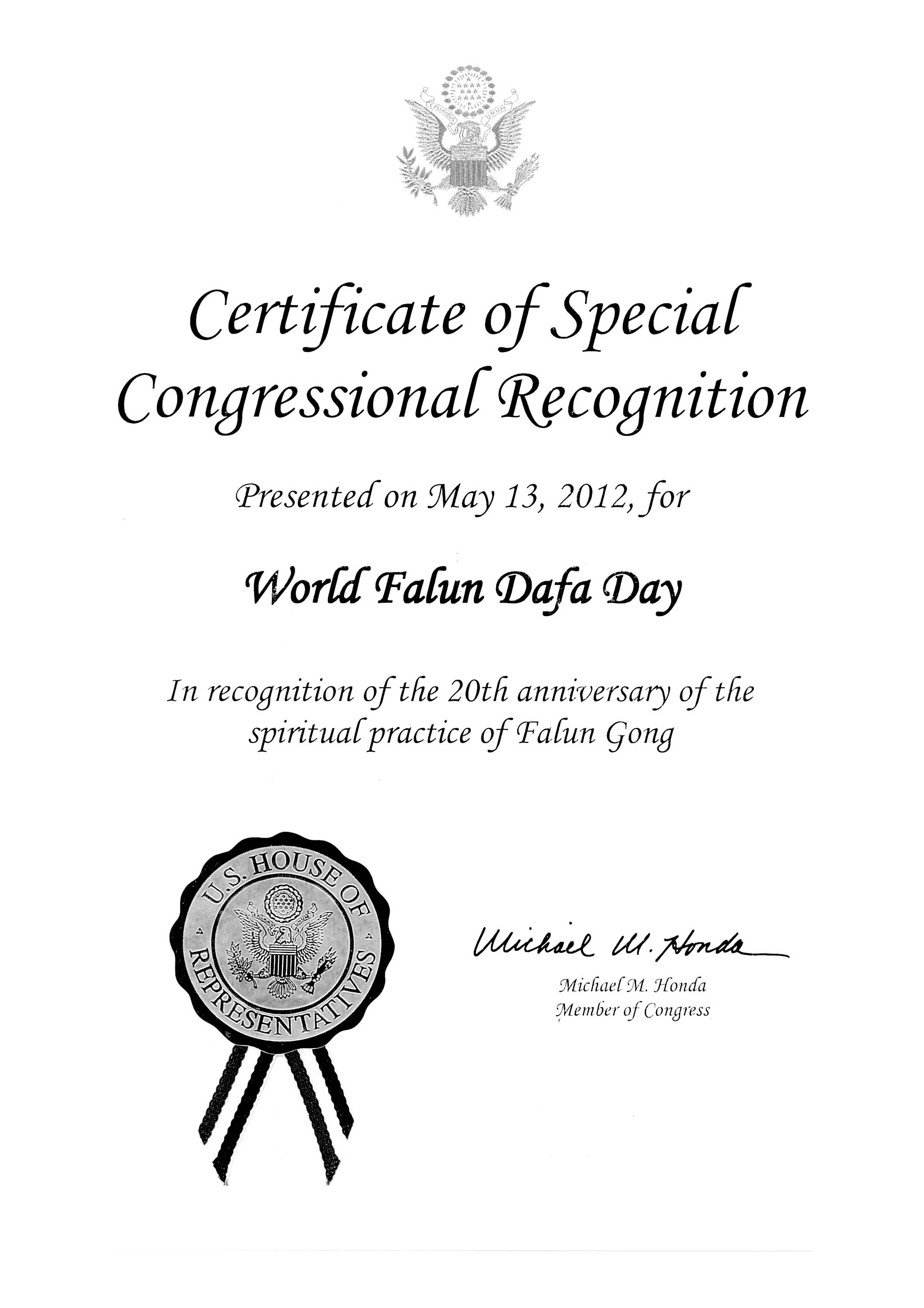 美国国会议员本田褒奖法轮大法