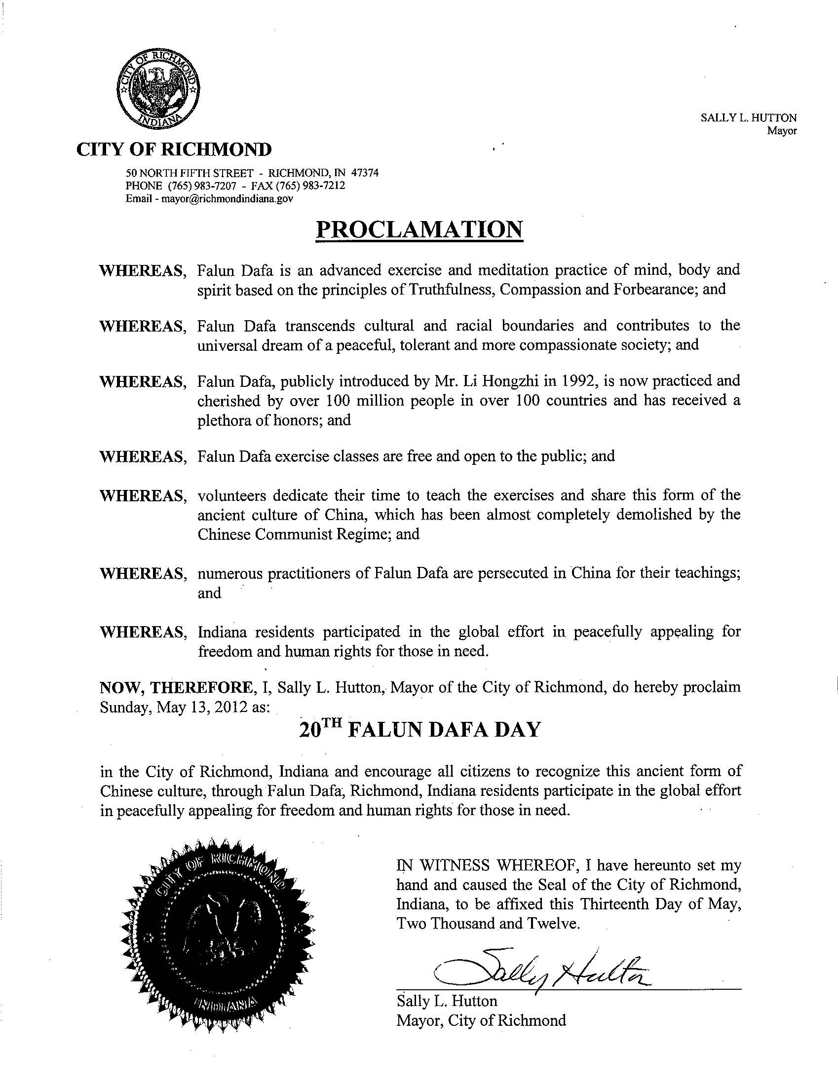 鉴此,我,印第安纳州里士满市市长,塞莉•哈特恩,特此宣告二零一二年五月十三日为印第安纳州里士满市法轮大法日,并呼吁所有里士满市市民认可法轮大法,并认可法轮大法修炼者为在中国遭受迫害的法轮大法修炼者,和平呼吁自由和人权所做出的全球性的努力。