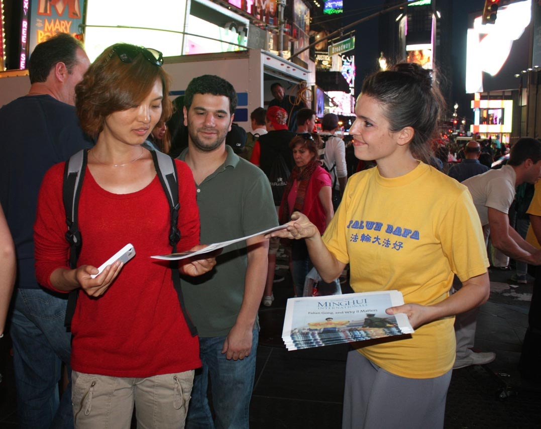 来自阿根廷的Latarlia天黑了依然在灯光下给路人发放法轮功真相资料。谈到今天的感受时,她激动地哭了。她说:“我修炼大法已经八年了。今天在这里(纽约)庆祝法轮大法洪传二十周年非同寻常,我几度哭出来了。游行队伍中的能量非常强大,身在这么多大法弟子中间,感到非常殊胜,对我来说,这是难以置信的美好经历。这些人(大法弟子)总是考虑别人,他们尽一切努力营救在中国被迫害的大法学员,帮助人们找回纯真的心灵,这就是‘善’和‘忍’。修炼法轮功之前,如果回顾我修炼前的生活和行为,我自己都不敢相信所发生的变化。(现在)我的脑子很直接,思考问题也不拖泥带水,我前面的道路也是直通未来。在工作中,在办公室里,不管做什么,我都会考虑别人。这与以前是不同的。现在我的心是敞亮的,不掩盖什么,不隐藏什么,生活的内容成了爱别人、帮助别人,而不只是想自己。当你心生慈悲的时候,一切就变得那么纯正祥和。”