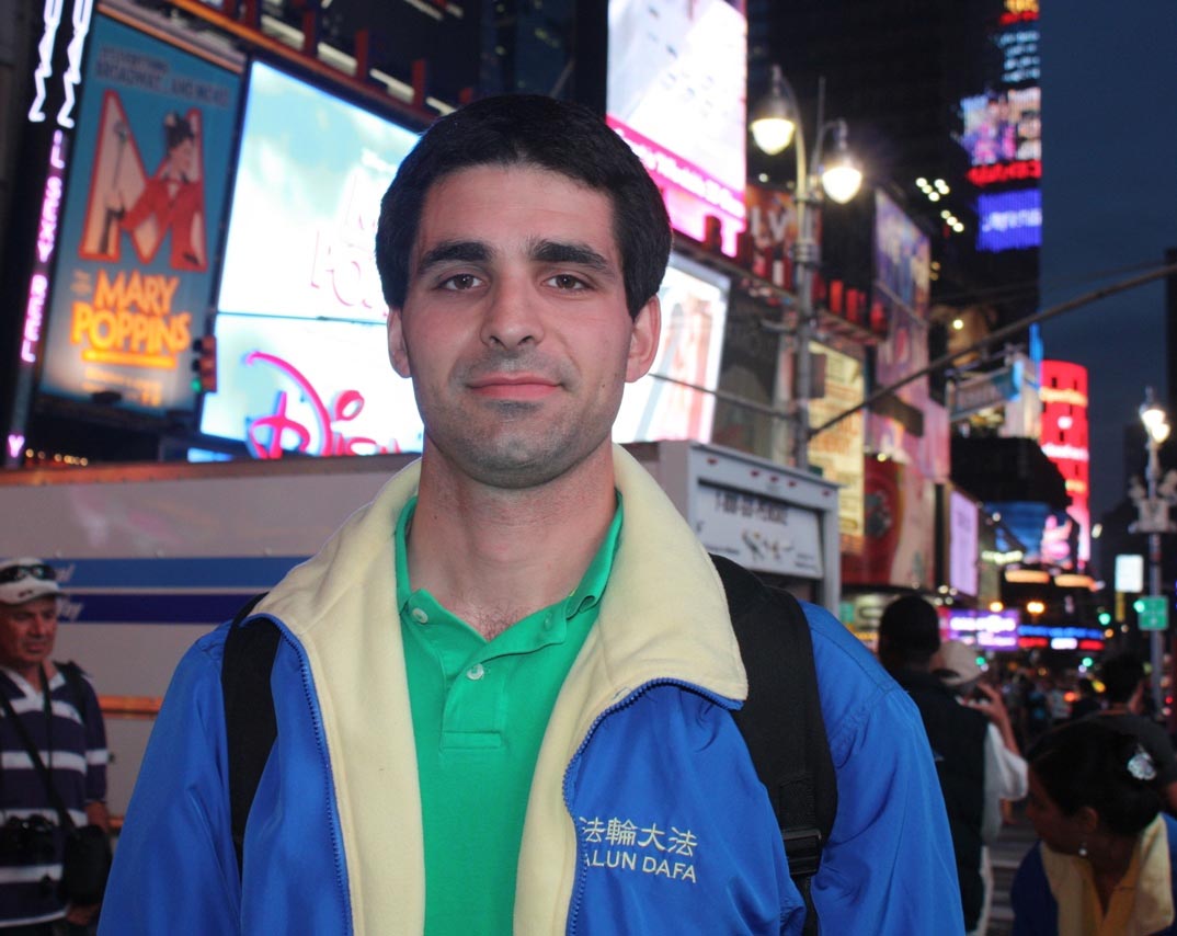 正在夜幕中帮助清场搬运工具上车的Jacob Zocco,因为忙碌了一天,还没有时间来细细回味自己的感受。但就在停下来的一刹那,他有感而发:“我住在纽约,修炼大法三年了。今天我感到很惊奇,来自世界各地的七千多名大法弟子在一起,来到纽约,这么多人在一起,真的很特别。我们在一起,彼此学习,庆祝大法洪传二十周年。修炼后我感到自己有更大的能量,健康得到改善。修炼前,我很多内在的东西,不管是肉体还是精神上,都非常糟糕,紊乱。修炼大法后,这一切都得到归正,我思想变得非常清晰,这是基本的,最基本的受益。李洪志大师传出的法轮大法,他解释了‘真、善、忍’的法理,我明白这是真正的法、真正的道,因为他解开了我心中所有的疑问。在修大法之前,我曾经做过其它身心健康练习,但是谁也没有教我。大法充满光明和希望,他是我生命的全部。遗憾的是,中共对大法及大法弟子持续进行迫害,仅仅因为他们带给世界真正的‘真、善、忍’。在中国,中共只教人们如何与人斗,你争我夺。今天,庆祝大法洪传二十年,对美国和对世界来说,都是神圣的一天。”