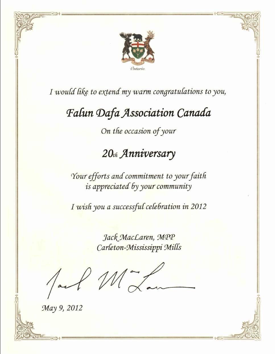 杰克•麦克拉伦省议员在贺信中表示:“在法轮大法洪传二十周年之际,我衷心的祝福你——法轮大法学会,你们的努力和付出会得到社区的感激。祝福你们二零一二年的庆典成功。”