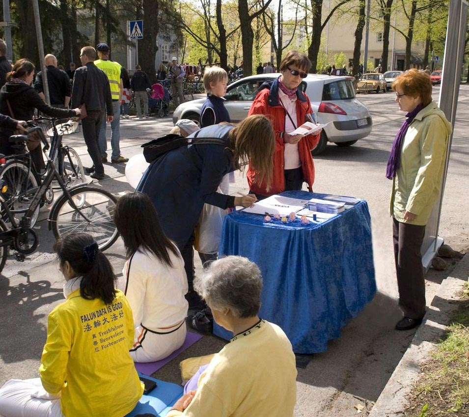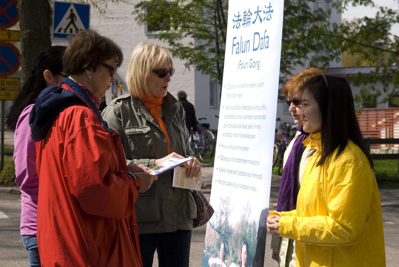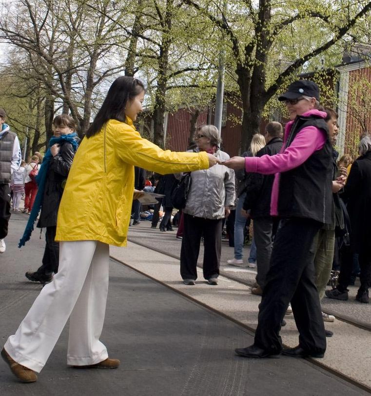 有很多人一听说是法轮功,就想起了两周前在电视台里播放的介绍节目。那是半个小时的采访报道,以一位住在芬兰的中国法轮功学员为主,讲述了她和她家人在中国被迫害的经历。看过的人都对中共迫害法轮功有了大概的认识。人们对中共用无耻下流的手段来迫害这群修炼人感到愤慨,并纷纷签名支持反迫害。