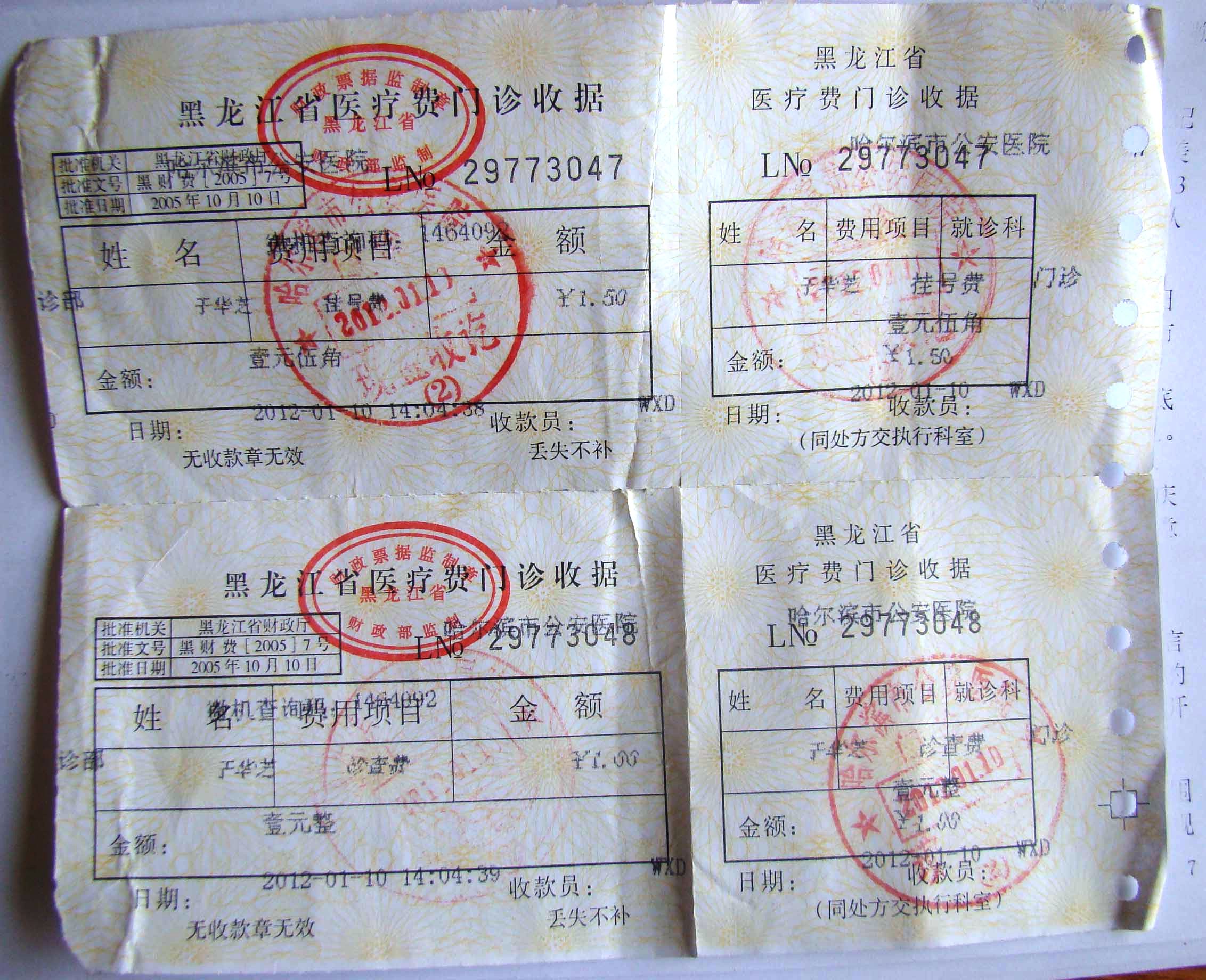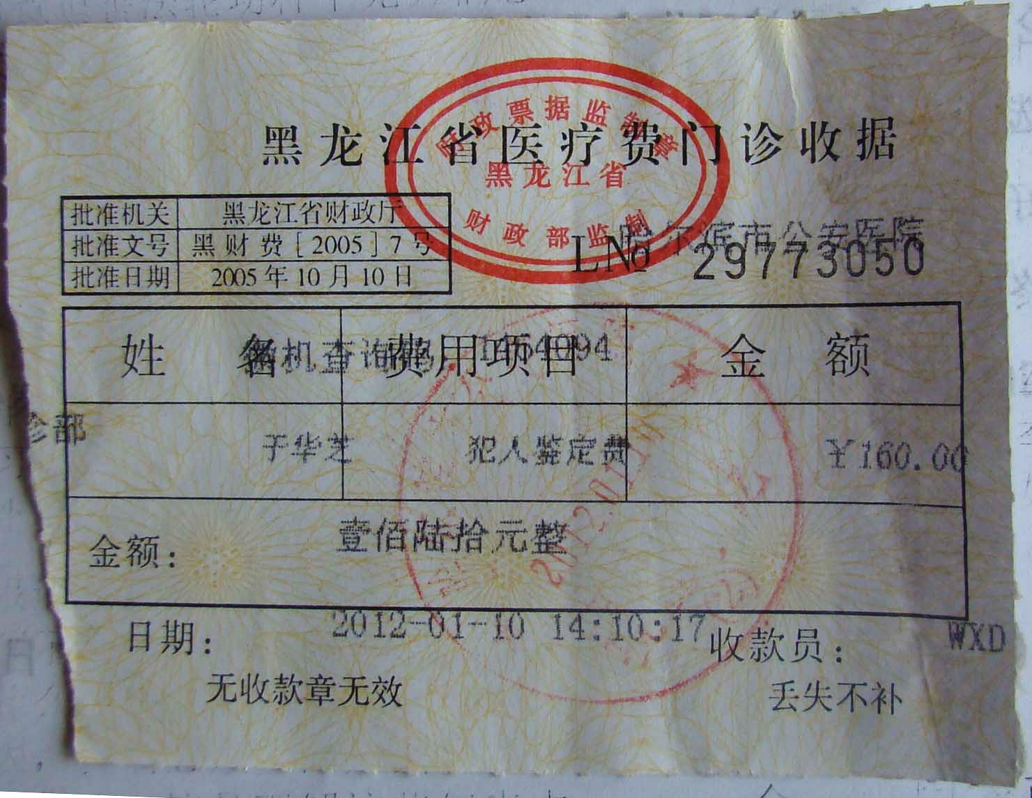 二零一二年四月十五日,于华芝被非法关押在鸭子圈看守所已五个月零十天了,看守所的警察还是不让于华芝家人见她,但却拿出于华芝关押期间在公安医院做心脏检查等的费用票据,让于华芝家人出钱。家人看到票据后更加担忧她的境况,不知她在鸭子圈受到了什么样的折磨,导致身体又出现问题。