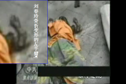 刘春玲被撞击,倒地之前,本能地抬起来手摸被打击的胸部,两手臂都正常。随之向后倾仰,身体向前弯曲,快倒地时,再露出的左手臂发现已经严重变形,虽然现在不知具体是怎么被打成这样,但通过手臂的严重变形,可见身体被打成什么样。刘春玲就这样现场被打死的。