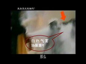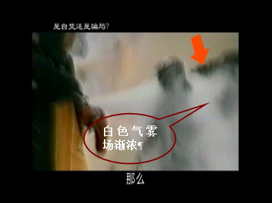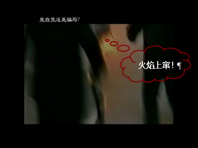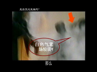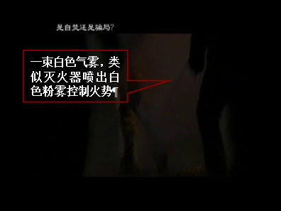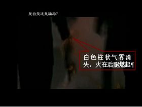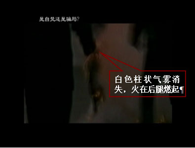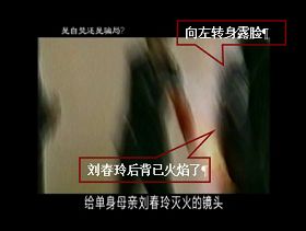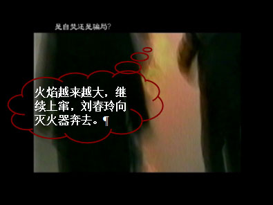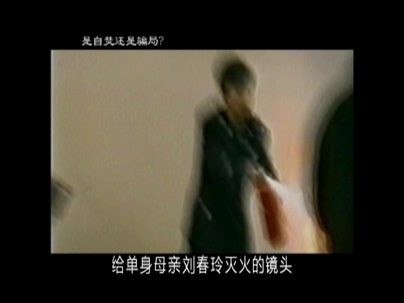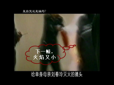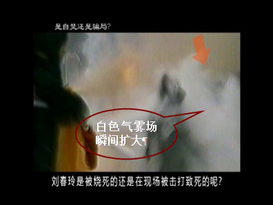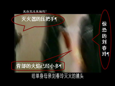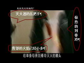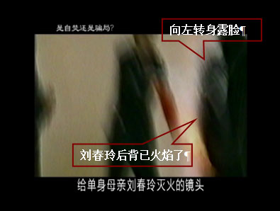 用绘声绘影软件对《是自焚还是骗局》观看、逐帧分析发现:录像开场就用了一个淡入转场,黑场逐渐显现直至正常的亮度。这个普通的转场却隐藏着起火过程,前五、六帧刘春玲小腿后面已起火,被一小束柱状白色气雾,类似灭火器喷出粉雾,不是用来灭火,而是控制着火势,等待角色到位。当刘春玲的前身被摄像机前警察遮挡时,白色柱状气雾消失,火焰迅速在刘春玲后腿、背部腾起。刘春玲正面对灭火器,在火焰中向前奔。