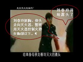刘春玲背对灭火器,背对着镜头,已没有明火,可警察继续向刘春玲喷粉雾,刘被白色气雾(灭火器喷出粉雾)笼罩,朦胧中一只手臂伸向了刘春玲的头部。在画面中显示出,灭火器撞击刘春玲弹出,在胸前闪过。