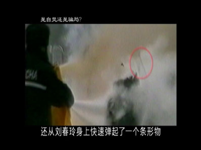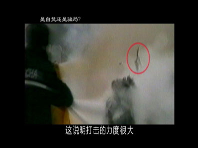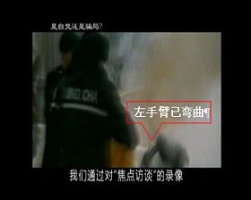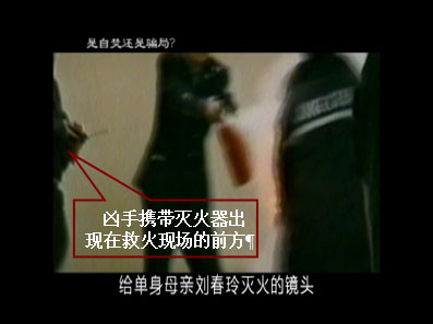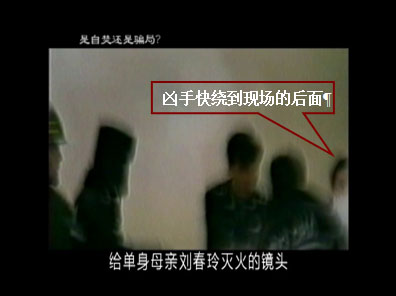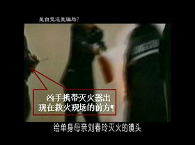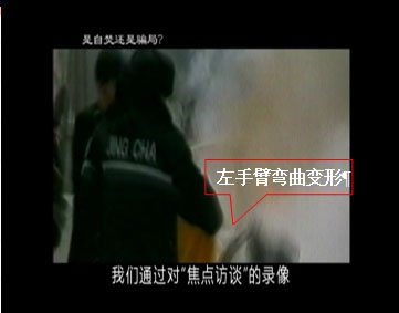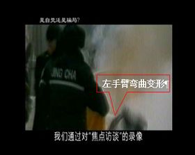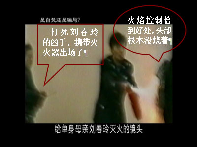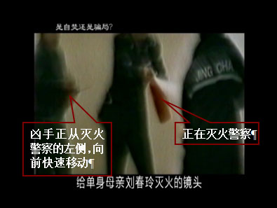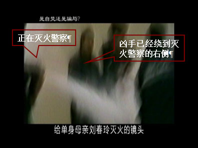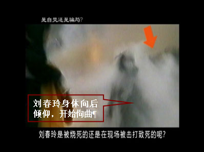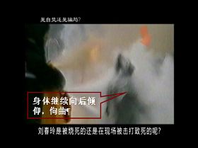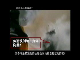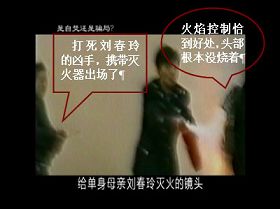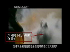 为此我们查看了《伪火》、《是自焚还是骗局》等天安门自焚事件现场录像的分析资料。用绘声绘影软件对《是自焚还是骗局》观看、逐帧分析,发现这是一场精心筹划的凶杀。自焚中的刘春玲只是配合演戏,头部根本没有火,不是被烧死,而是警察用灭火器击打,当场将刘春玲左手臂打得严重变形,是现场被打死的。