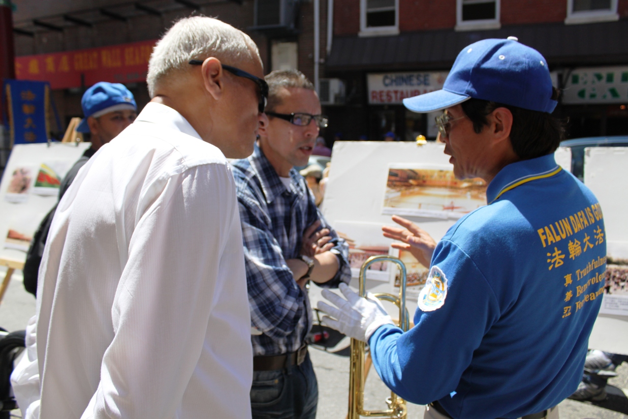 家住北费城的培博(Peebles)先生与两位朋友途经中国城,他们很高兴能看到精彩的文艺表演和法轮功学员的现场功法演示。培博先生表示:“今天我们看到的精彩表演代表了中国传统文化。”他并表示对中共政府迫害法轮功不能理解,“这么平和的打坐功法,为什么不准许在中国炼呢?”他和朋友拿着法轮功功法介绍的传单,表示回去要上网好好了解一下原因。