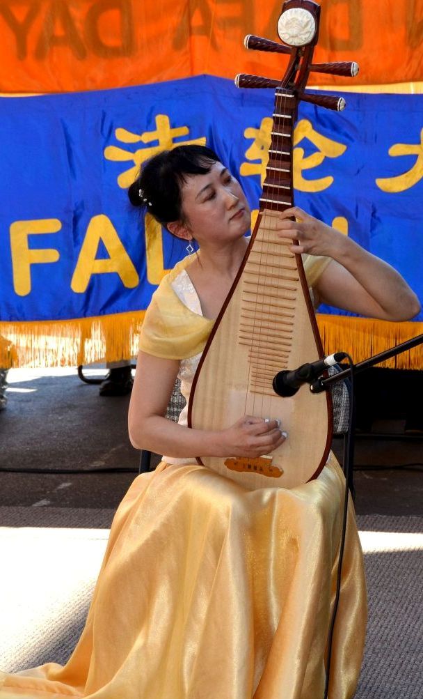 ![]() 大费城明慧学校小弟子在表演莲花舞 | ![]() 法轮功学员在演奏琵琶 |
