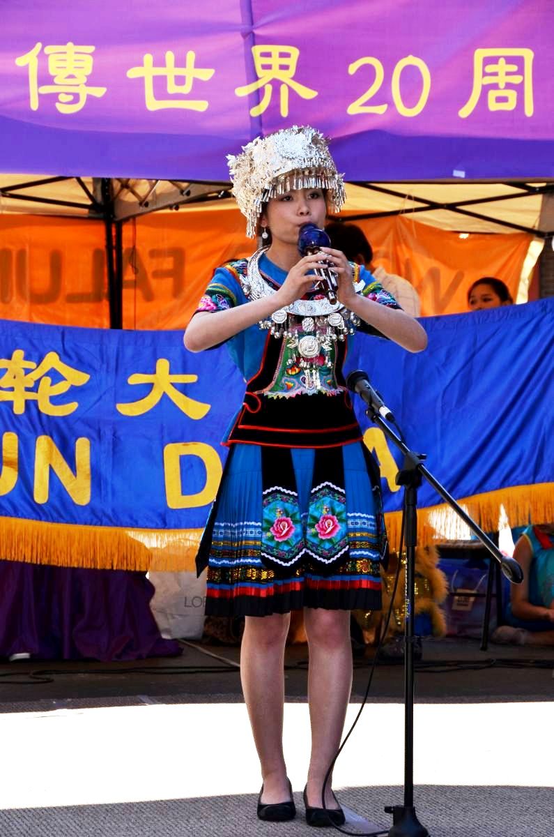 ![]() 法轮功学员在演奏傣族乐器葫芦丝 | ![]() 法轮功学员表演独唱 |