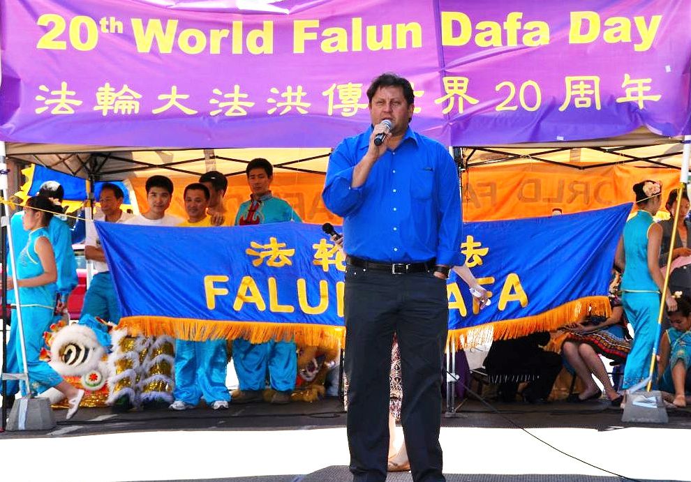 性格开朗的路易斯•菲利普生(Louis Philipson)先生夫妇请远道来的朋友一家人来中国城吃午饭,看到了法轮功学员的纪念活动。他手里拿着真相材料,大声的对他的朋友讲起了他所了解的法轮功。他说:“我知道法轮功(修炼者)炼功、打坐,做好人。这没有什么不对的地方。可是中国政府迫害他们。人人都应该有信仰的权利。我很高兴他们能在这里集会。我向他们送上我的问候。”