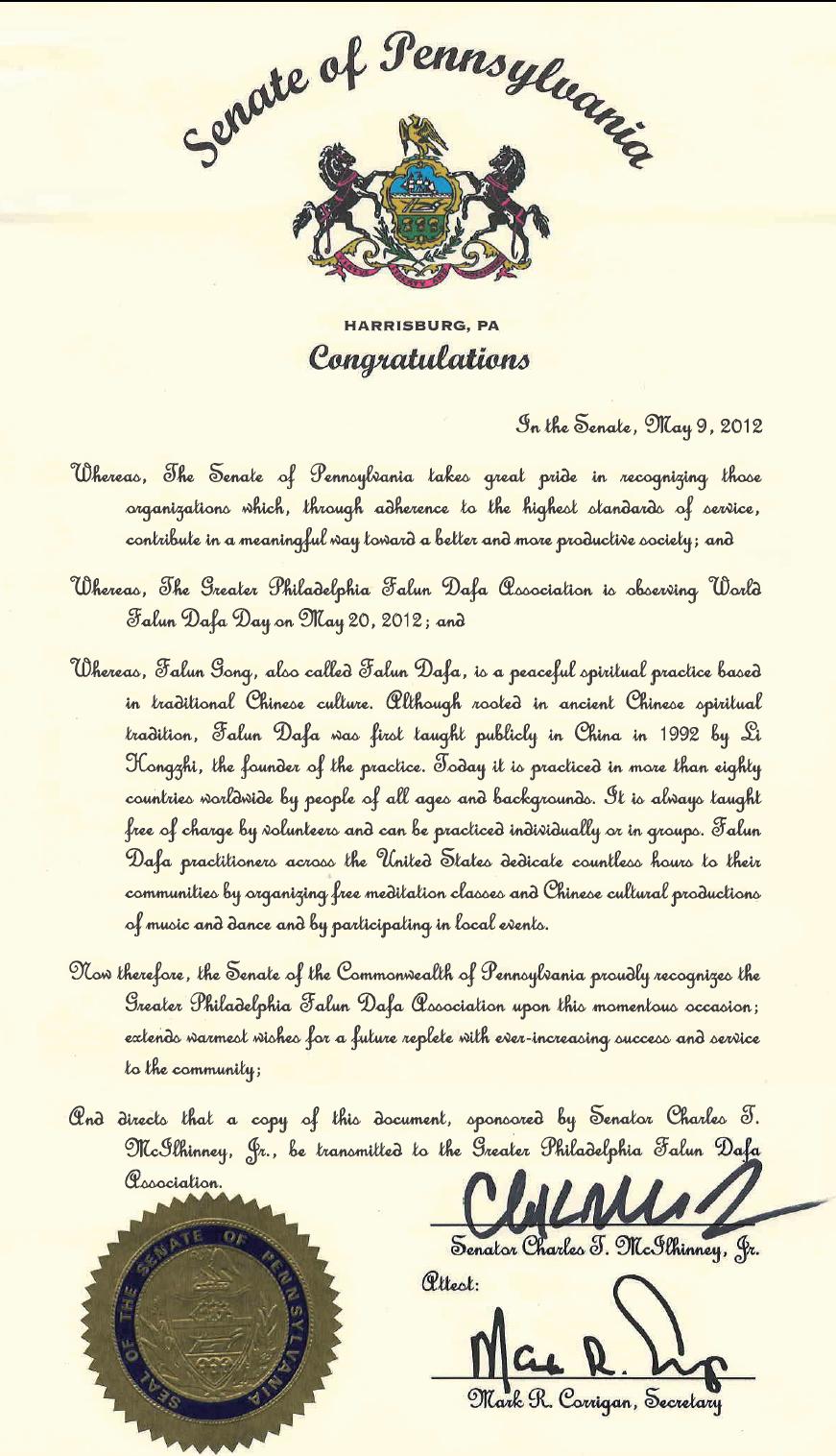 鉴此,宾夕法尼亚州参议院在这个重要时刻骄傲地表彰大费城法轮大法学会;并最诚挚地祝愿他们将来给社区带来更多的成功和服务。