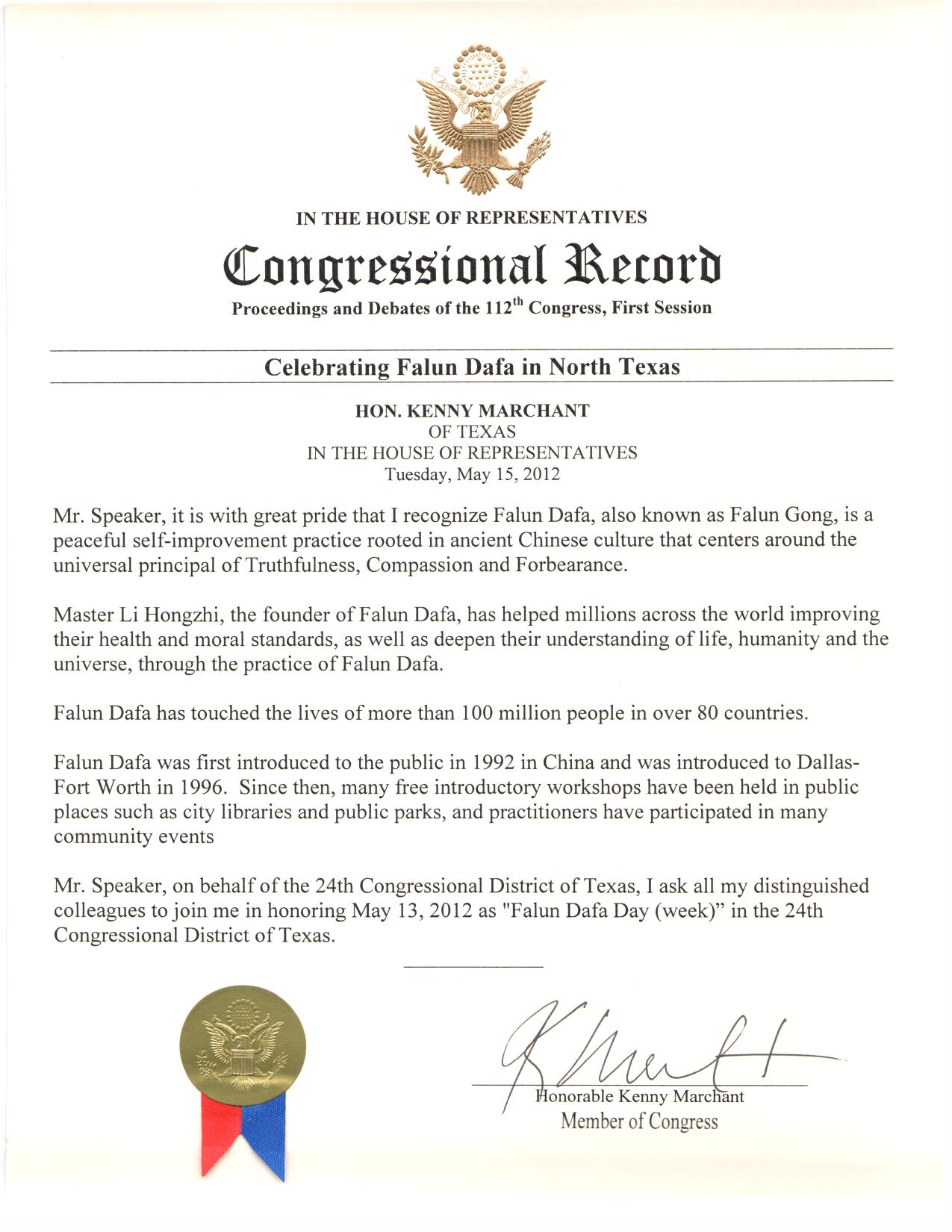 我代表德州第二十四选区,诚邀我的同僚与我一起褒奖二零一二年五月十三日为德州第二十四选区的世界法轮大法日(周)。