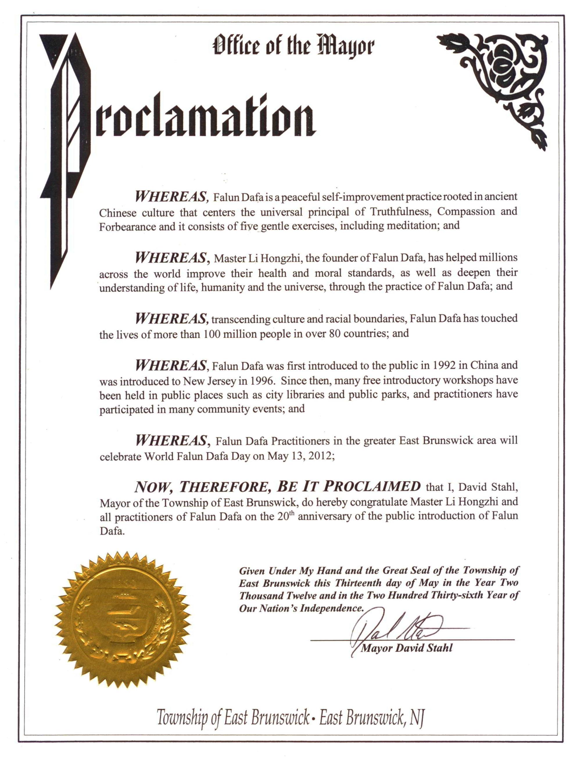 现在,我大卫•斯达尔,作为东布朗士维克市长发布褒奖,在法轮大法传出二十周年之际向李洪志大师及其所有法轮大法修炼者表示祝贺。