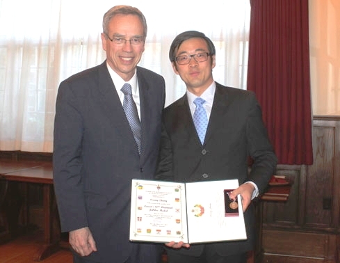 ![]() 法轮功学员张丕兴在多伦多接受加拿大自然资源部长欧理华(Joe Oliver)代表政府颁发的英女王伊丽莎白二世钻石纪念奖章(Queen Elizabeth II Diamond Jubilee Medal)。 |