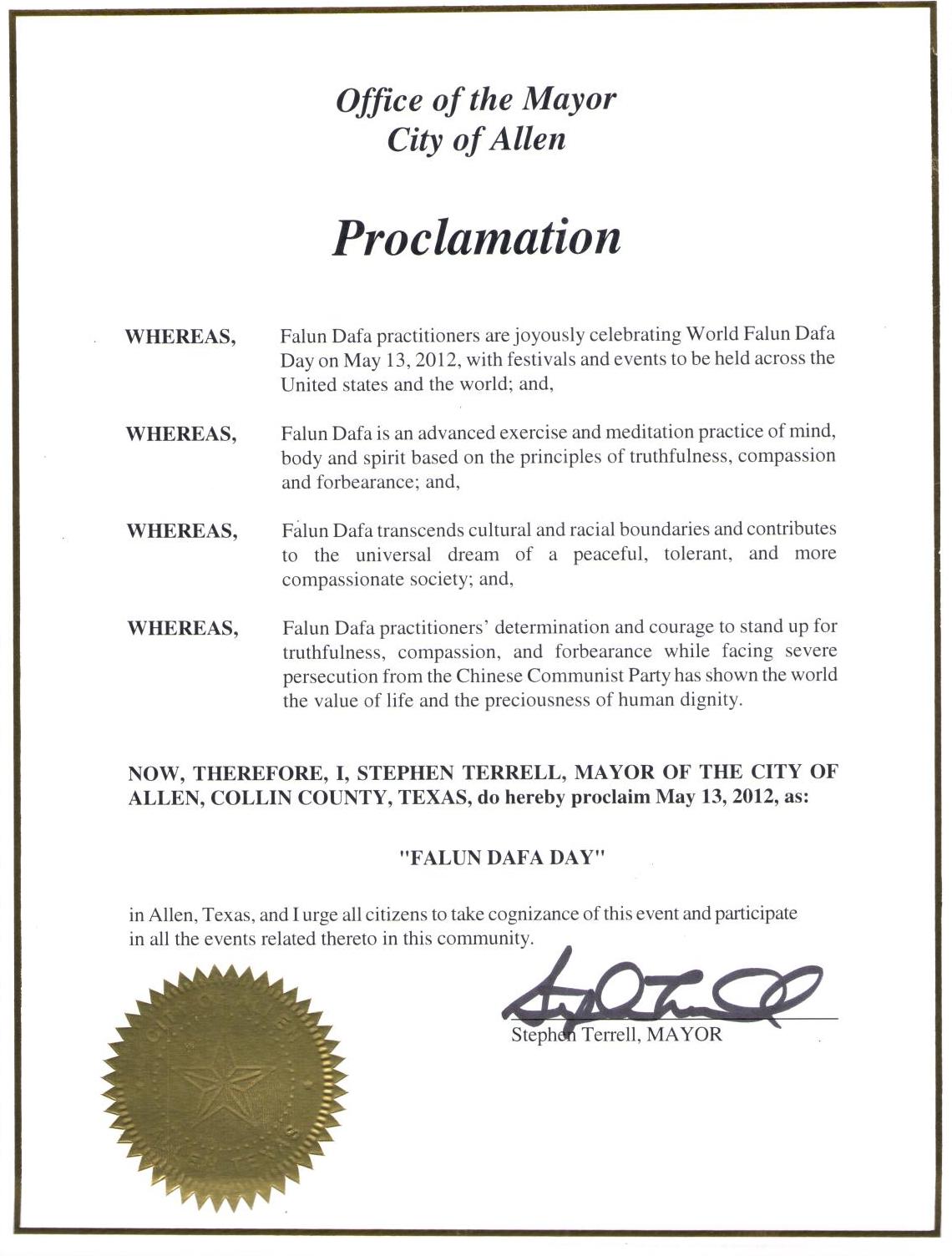 因此,我,史蒂夫·泰瑞尔,艾伦市市长宣布二零一二年五月十三日为“法轮大法日”,并呼吁所有艾伦市居民与法轮大法学员一起在社区庆祝与其有关的活动。