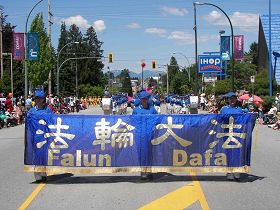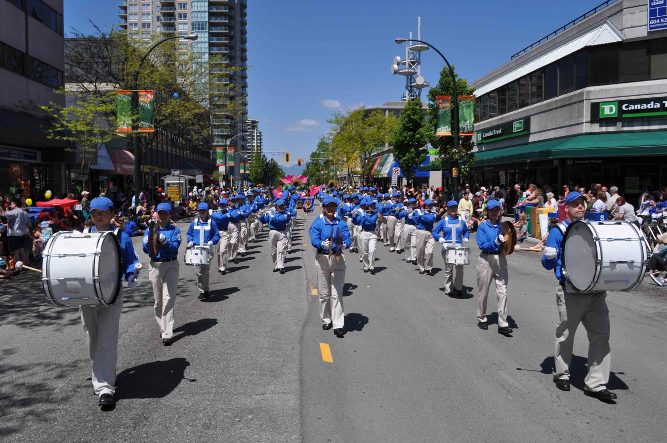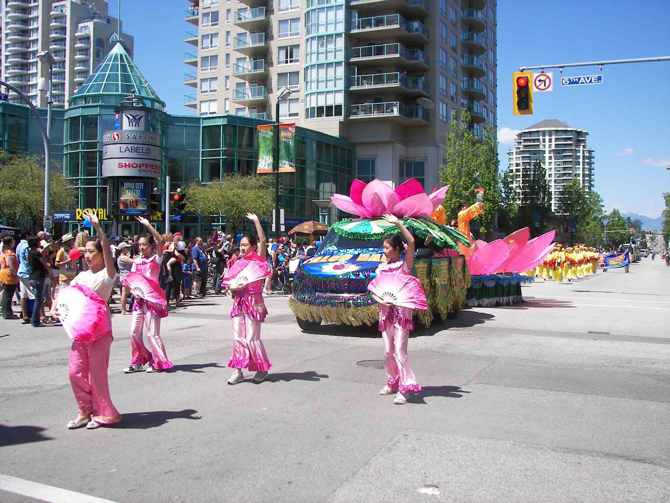 法轮功学员的游行队伍由天国乐团、仙女队、腰鼓队、花车等部份组成,备受欢迎,沿途民众报以热烈的掌声和欢呼。天国乐团演奏了《法轮大法好》、《法鼓法号震十方》、《永远的枫叶》等曲目,当法轮大法游行队伍经过主席台时,主持人赞叹“真是令人瞩目的队伍, 让我们欢迎法轮大法团体”。