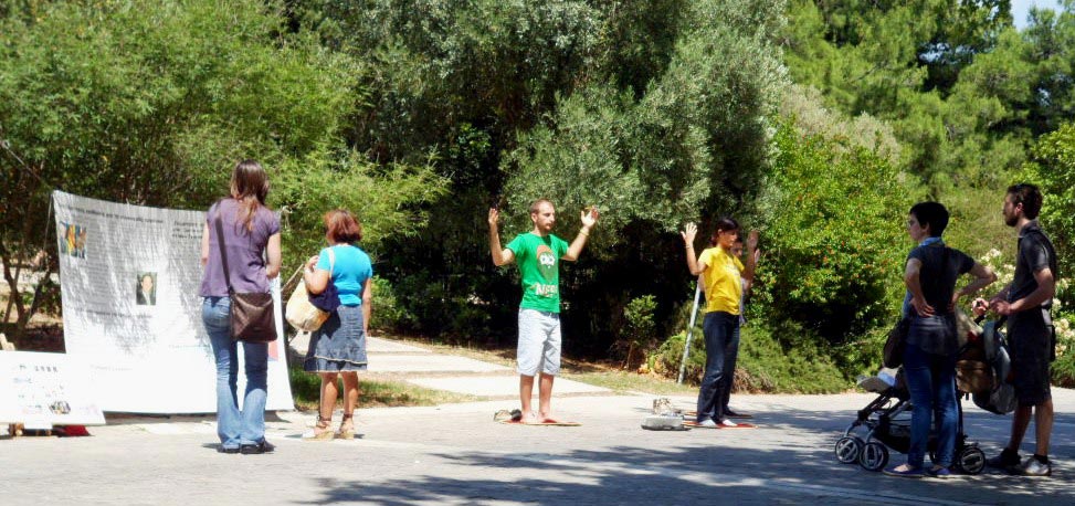 ![]() 希腊学员在雅典的卫城博物馆旁举办信息日活动。不少游人驻足观看,了解法轮功真相。 |