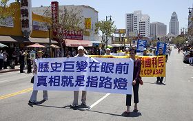 :退.集会。'>洛杉矶的法轮功学员举行声援一亿一千六百万三:退.集会。 |