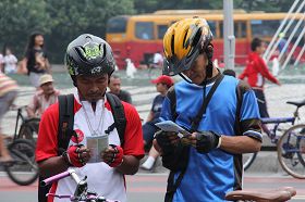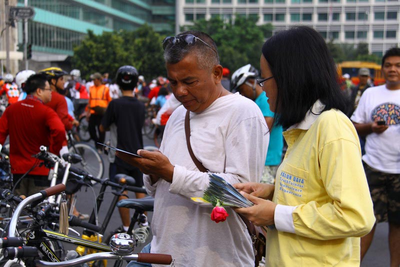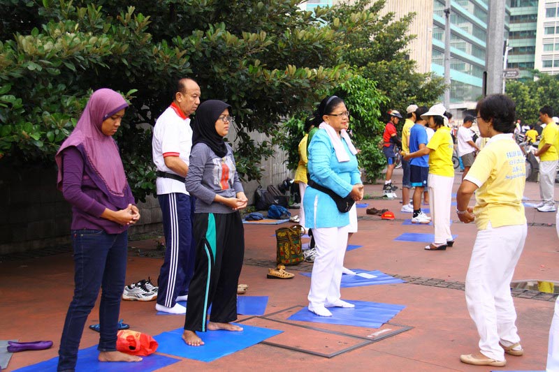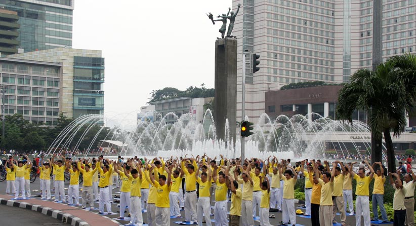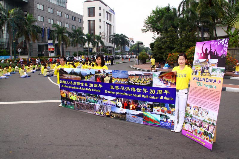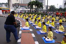 ![]() 庆祝世界法轮大法日,印尼雅加达学员在繁华的市区集体大炼功,让人们了解大法美好。 |