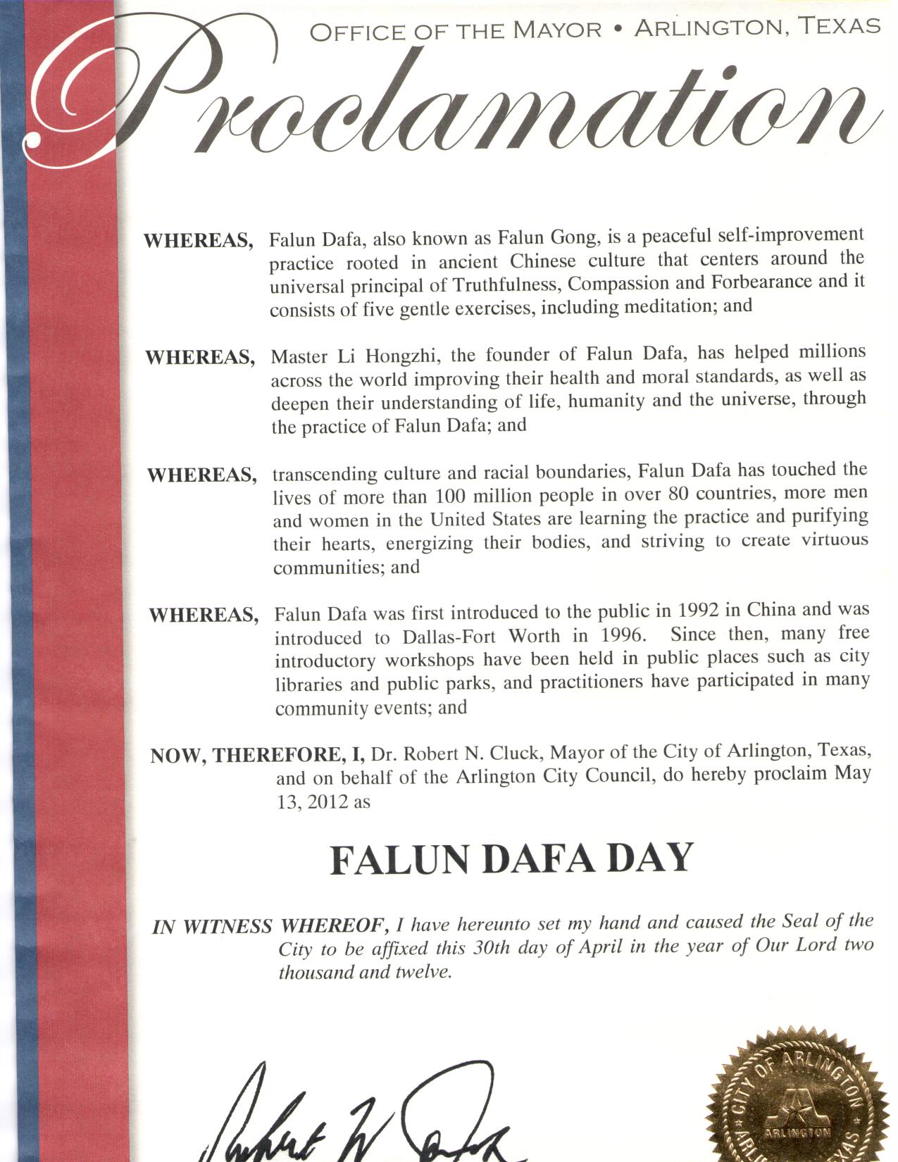 鉴于,法轮大法从一九九二年在中国传出。一九九六年法轮大法弘传到达拉斯-福特沃斯地区。从那以后,在达福地区许多图书馆、公园举办了许多期免费法轮大法教功班。(法轮大法修炼者)参加了许许多多社区活动;